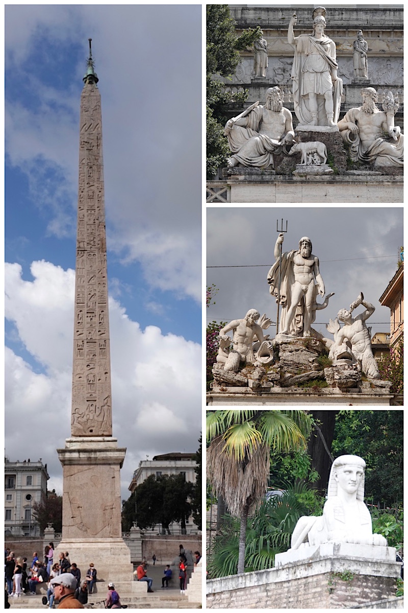 Fountains and sculptures from the Piazza del Popolo, including several sphinx atop the piazza wall.