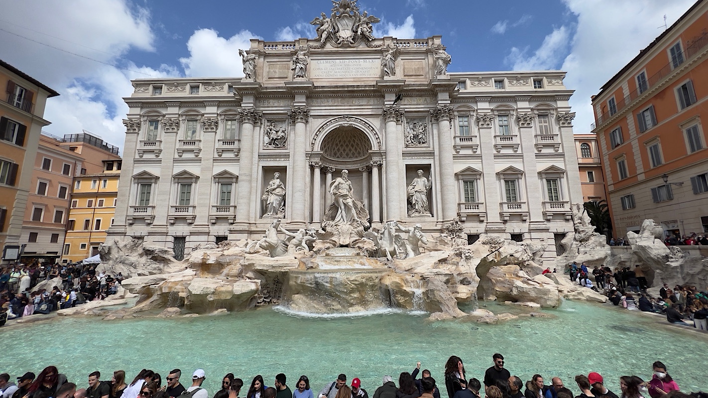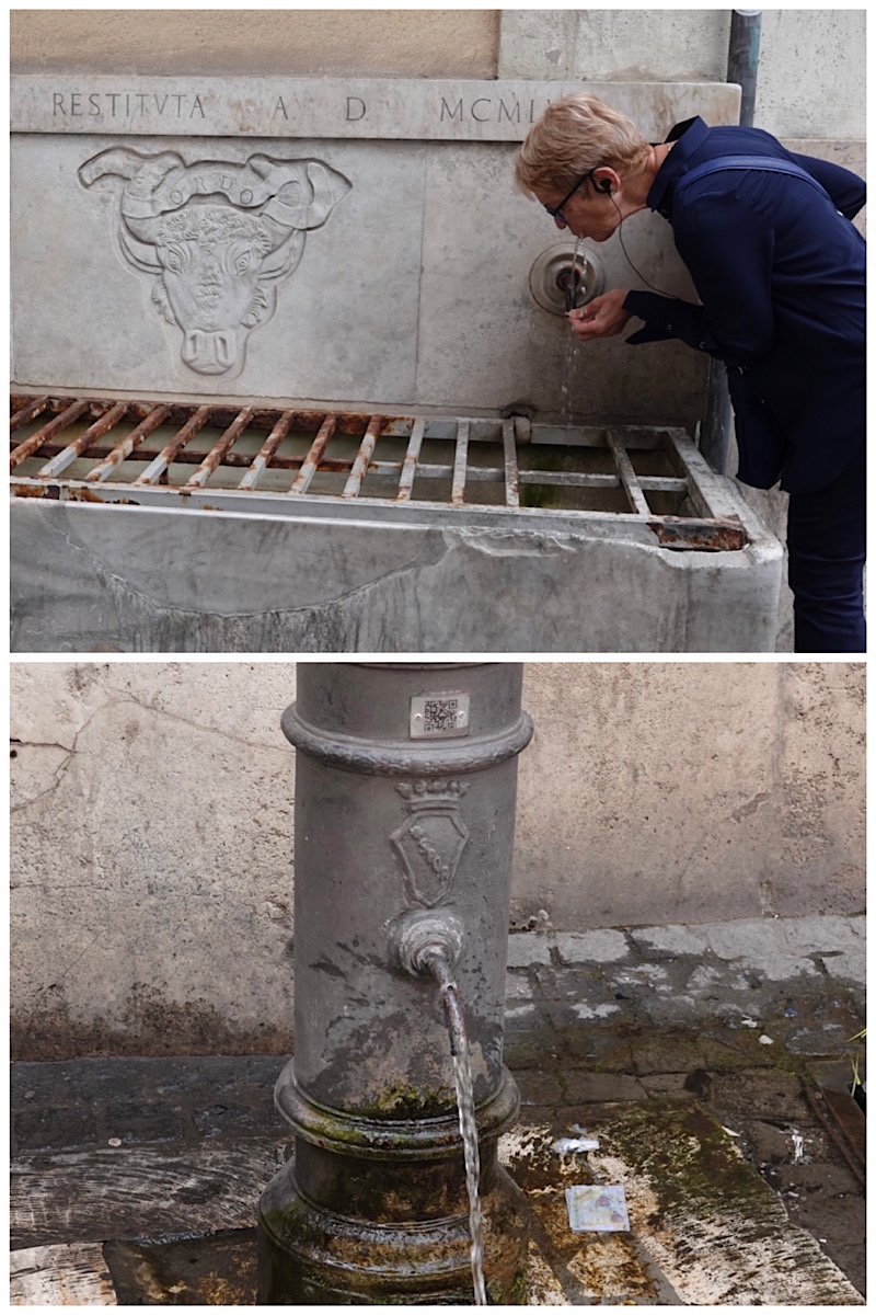 One of Rome’s many fountains dating back to Roman aqueducts bringing water into the city. The water is fresh, cold, and safe to drink. The taps “run” all the time – plug the bottom of the tap and the water spurts out if a hole on the top of the tap, creating a drinking fountain!