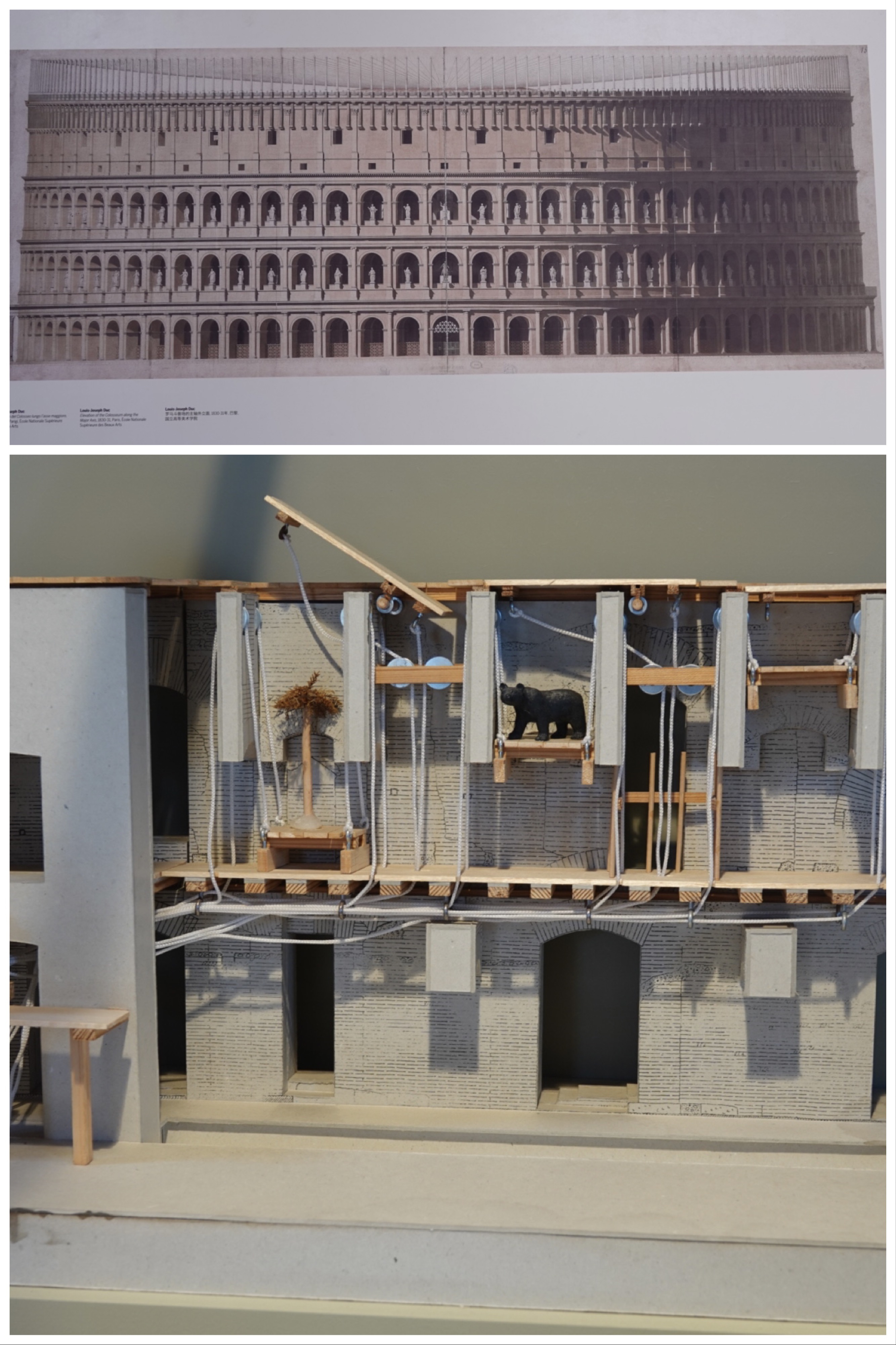 An artist’s rendering of what the Colosseum looked like in its heyday, when the stone surfaces were clad with marble, the niches filled with statues, and the wooden poles for the cloth roof (like an awning) were in place. There was also a model of how the Colosseum’s elevators worked.