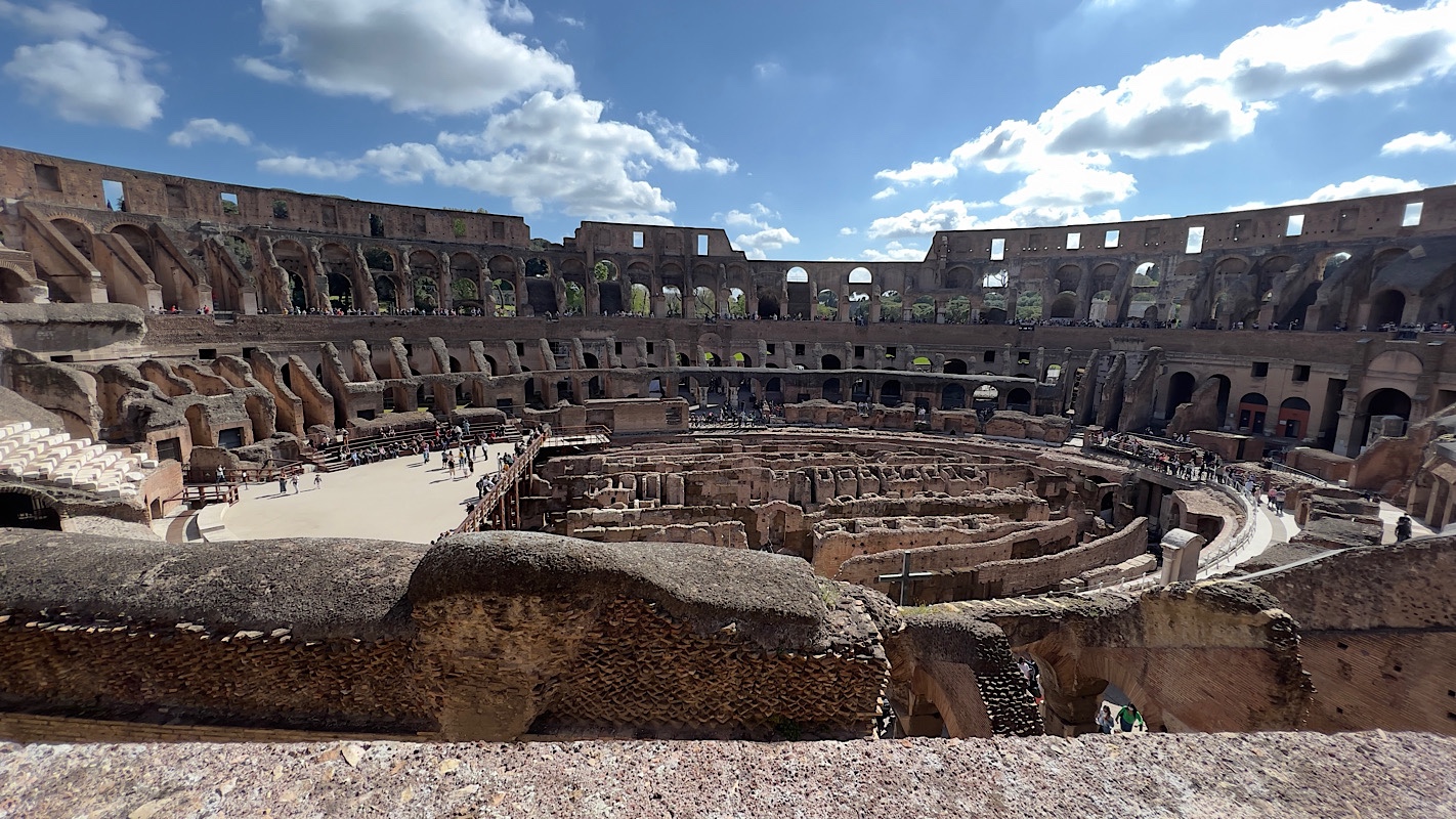 The Colosseum interior, which seated up to 50,000. What surprised me the most was how much it reminded me of current football stadiums: elliptical, banked seats, multiple entrances (and ticket values), exterior dividers to get people into lines to enter… it all felt very familiar.