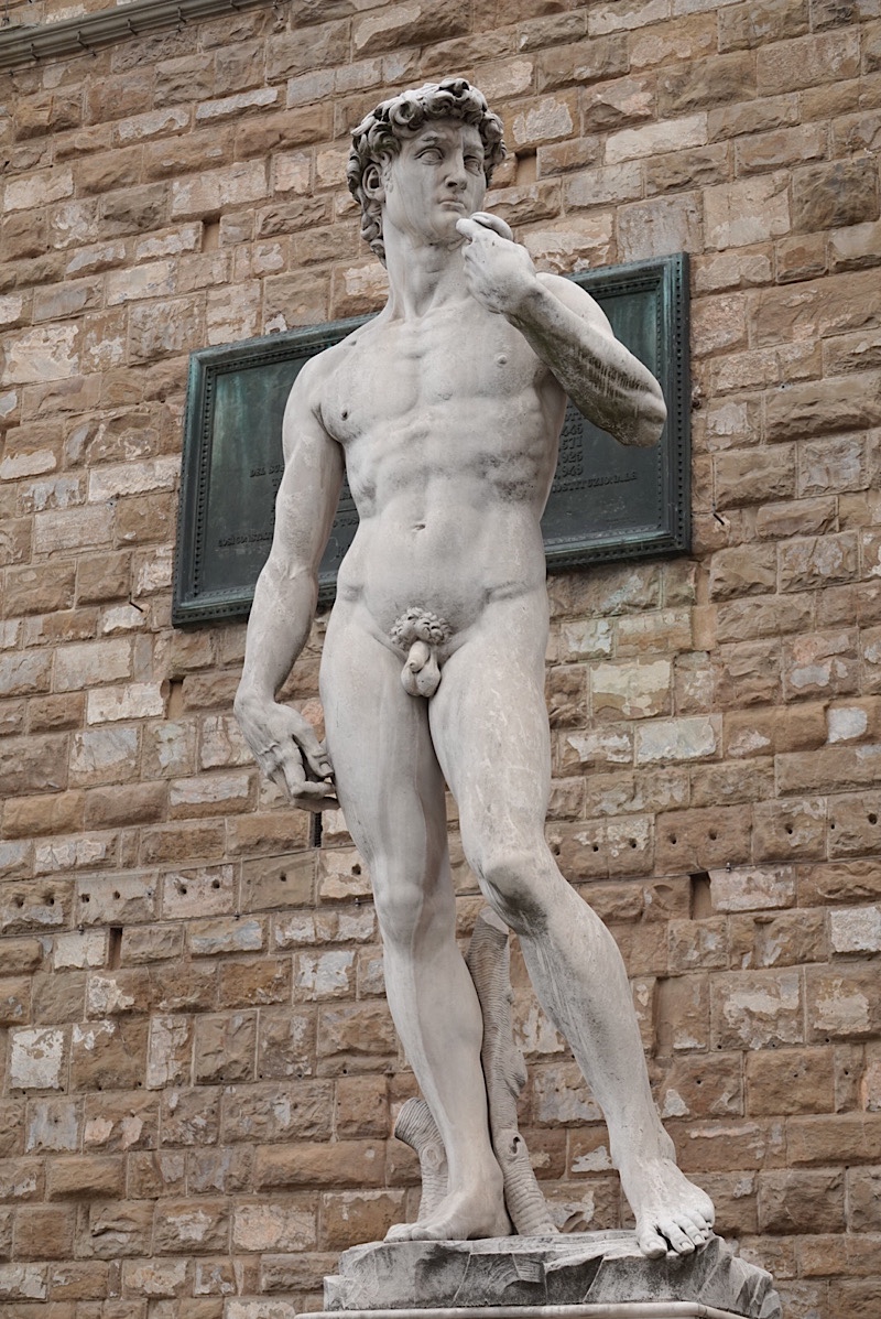 We left the courtyard of the Uffizi and entered the Piazza della Signoria (Duomo Piazza) in front of the Palazzo Vecchio (old palace), one-time residence of the Medici…. and there was Michelangelo’s David. It is a replica, made in 1910, and stands where the David statue was originally erected. The original was moved into the Academia Gallery museum in Florence to protect it from deterioration. Replica or not, it was magnificent (that might be my word of the day for Florence).