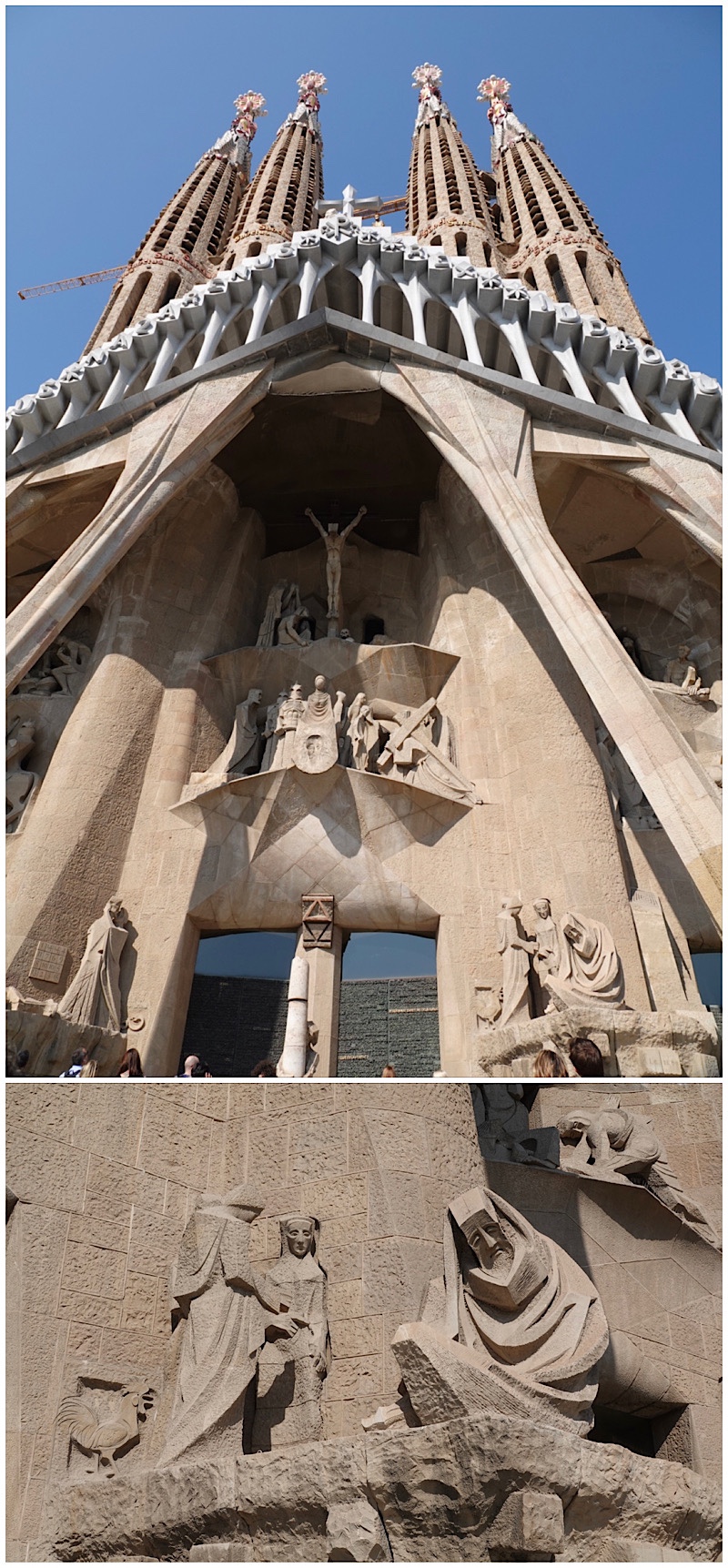 The “Death” (Passion) facade, on the opposite side from Birth, is complete, and features figures with a very squared off angular style, not at all like Gaudi’s smooth curves and silhouettes taken from nature.
