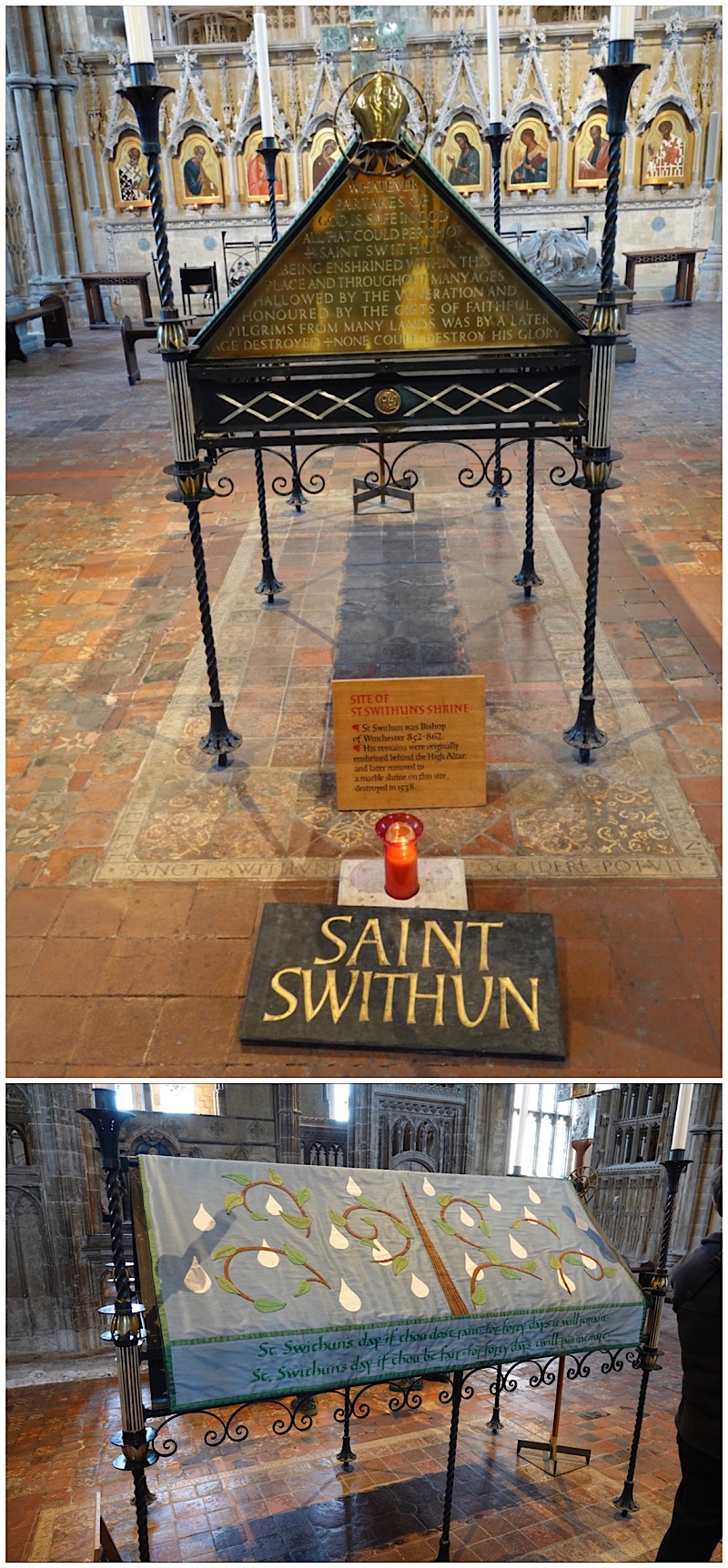 It was only a short drive from Portsmouth to Winchester, the historic city famous for its 11th century Romanesque/Norman cathedral. The cathedral’s full name is “the Cathedral Church of the Holy Trinity, Saint Peter, Saint Paul and Saint Swithun”. Quite a mouthful. The current church was built between 1079 and 1532, but there was already a church on this site in the late 600’s. it’s impossible to get a photo pf the entire cathedral due to its huge size, so Ted took photos from several angles to help us remember what it looked like.