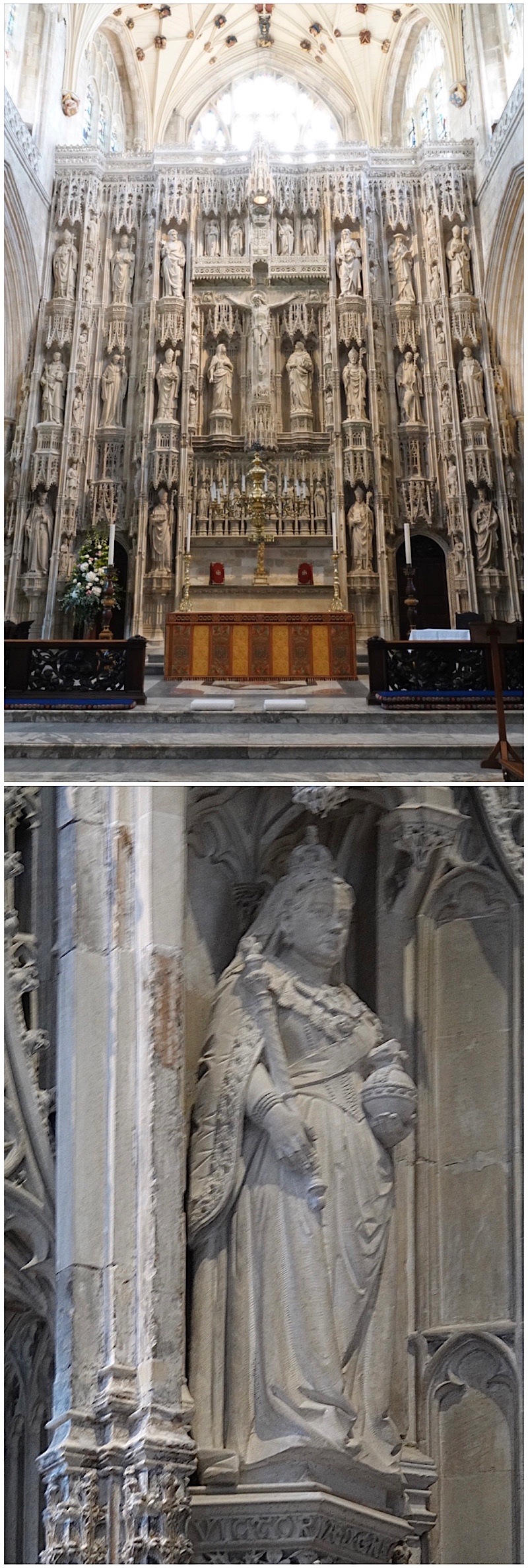 The reredos (ornamental screen) behind the main altar is nothing short of spectacular. The original screen dates to 1450 to 1476, but many of the statues were – again – destroyed during the Cromwellian times, and much of the current statuary dates to Victorian times. If fact, the screen includes a small statue of Queen Victoria, who personally funded a portion of the restoration.