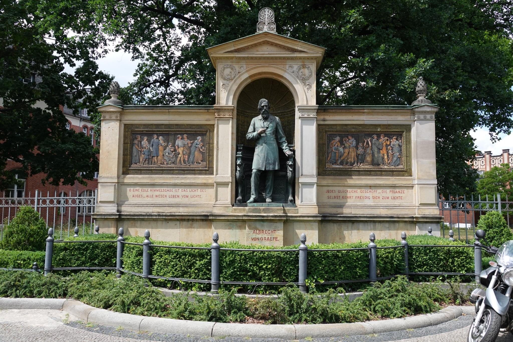Memorial to Albrecht von Graefe outside the gardens of the Charité Hospital., on the corner of our street. Albrecht was a Prussian-German ophthalmologist who lived from 1828-1870, who was famous for breakthroughs in the treatment of glaucoma. The statue’s engravings celebrate the importance of light to humans.