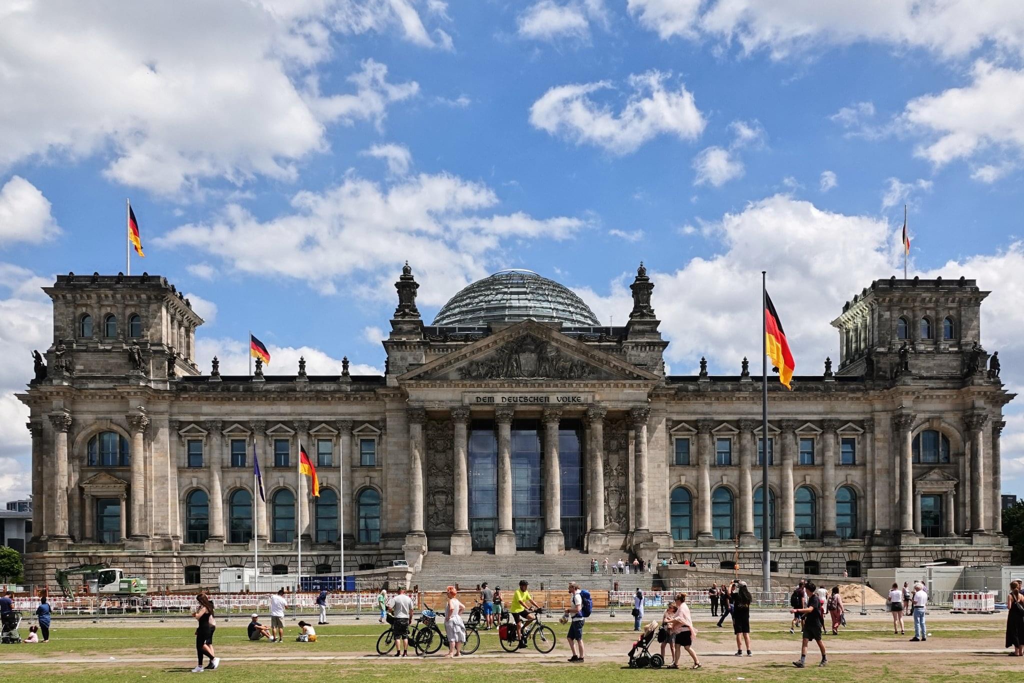 Crossing the Spree to reach the Bundestag. The complex in the background with the large red DB (for Deutsche Bahn) is Berlin’s Hauptbahnhof (main train station). We can get anywhere from here! The office building in the left foreground is the aptly named Berlin Cube.