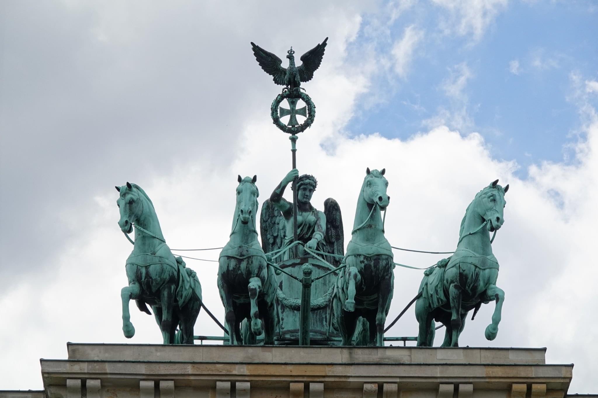In 1795 the monument was crowned with a chariot drawn by four horses heading into the city, known as the Quadriga. The bronze statue represents the Goddess of Victory. The original sculpture was destroyed during World War II, so it was replaced by an exact replica made in West Germany in 1969. (Caption taken from introducingberlin.com. The photo, of course, is Ted’s)