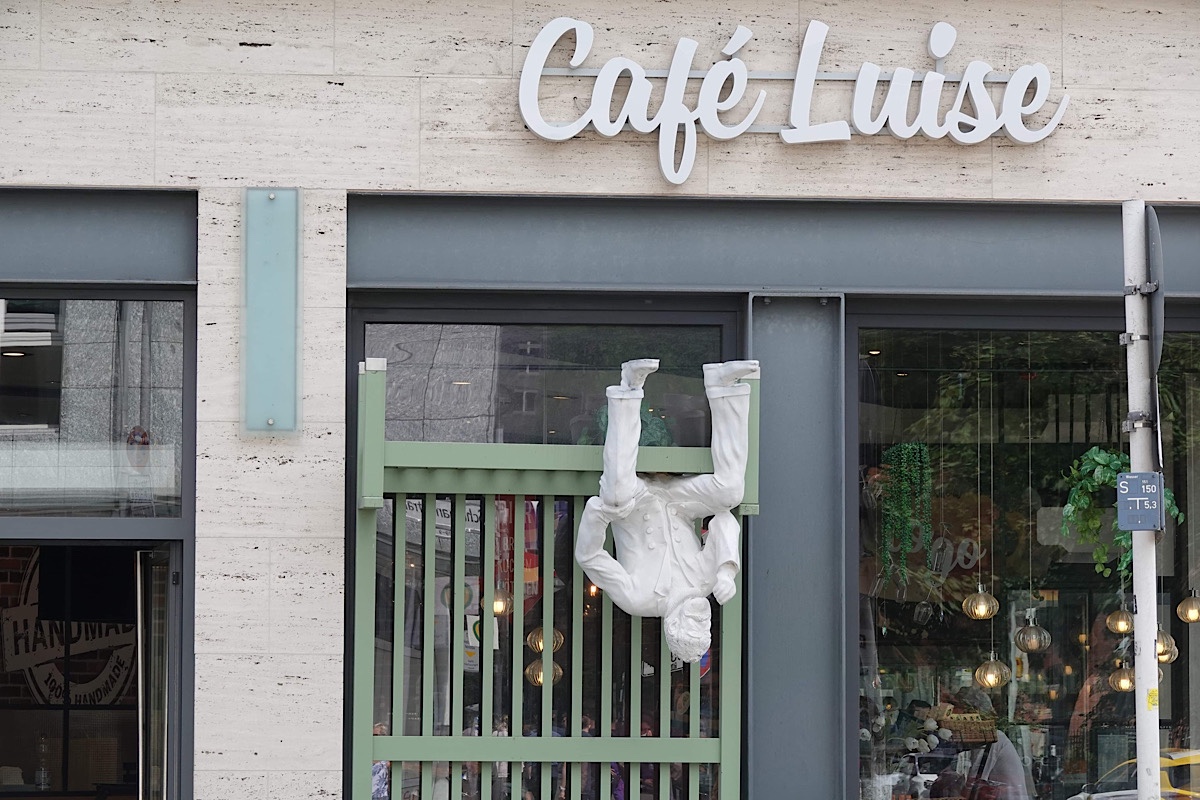 Kitty-corner from us on Schumannstraße is this lovely bakery. We’re not sure whether it’s the heavenly breads or the strong coffee that made this sculpted patron “flip” !