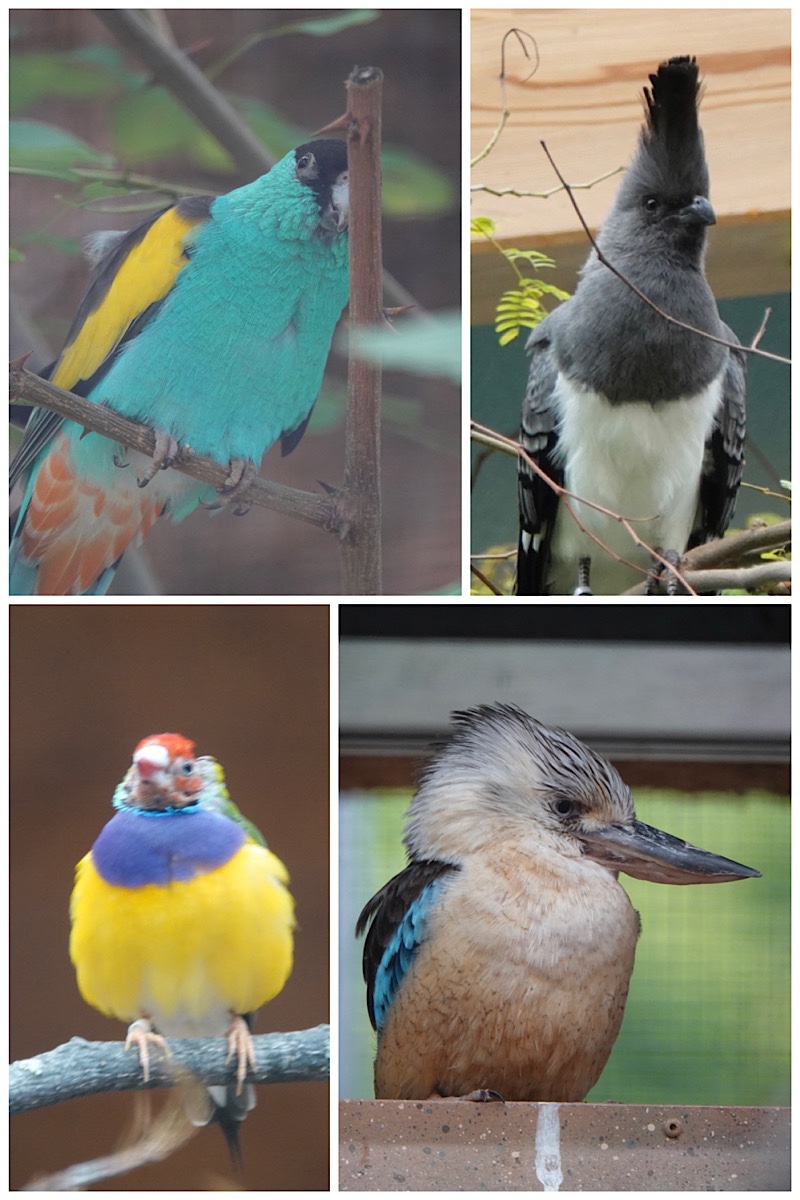Bottom L: Gouldian finch. Bottom R: blue-winged kookaburra