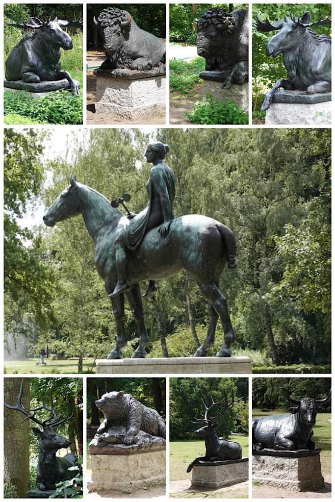 (Below) One small area of the park, with radiating spokes leading out from a central parkette, is called the Floraplatz, and originated in the eighteenth century when the Tiergarten Park underwent that transformation (by Royal Decree of Frederick the Great dated 30.11.1741) from royal hunting ground to public park and pleasure ground of the Royal Seat of Berlin. Based on the eight figures of animals that the Berlin sculptor Rudolf Siemering (1835 1905) had created for the George Washington Monument in Philadelphia USA, Kaiser Wilhelm decided that copies should be made for the Floraplatz in 1906. His predecessor’s Baroque statue of Flora was removed and replaced with a replica of the bronze equestrian statue Amazone zu Pferde (Amazon on horseback) by Louis Tuaillon (1862-1919) that stood in front of the National Gallery. When the Tiergarten Park was restored in the early, 1950s, six of the eight animal statues which had suffered varying degrees of damage during the Second World War were installed in random sites around Tiergarten. The bull and the bear went missing entirely, probably looted and melted for their metal value, recreated from the molds that still exist in the USA. Only in 2020 were the 8 animals put back into their original 1906 positions.