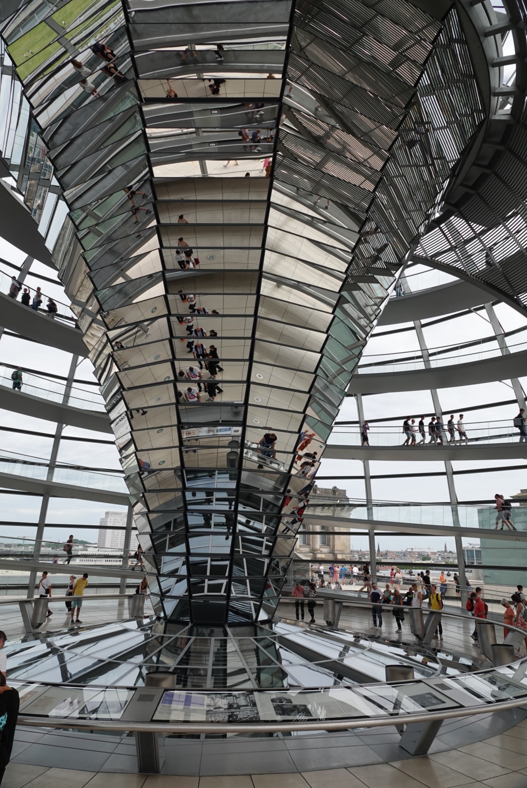 We got to see the library, the (door to the) Chancellor’s office, the reflection and prayer room, the remnants of Soviet WWII graffiti, a portion of the original tunnel between the Reichstag and the main administrative building, and of course the plenary chamber where almost 800 elected officials can be overseen by a public gallery of 500 spectators. After the guided portion of our tour we got to walk to the top of the Reichstag’s famous glass dome, from which vantage point we had an incredible 360° view of the city.