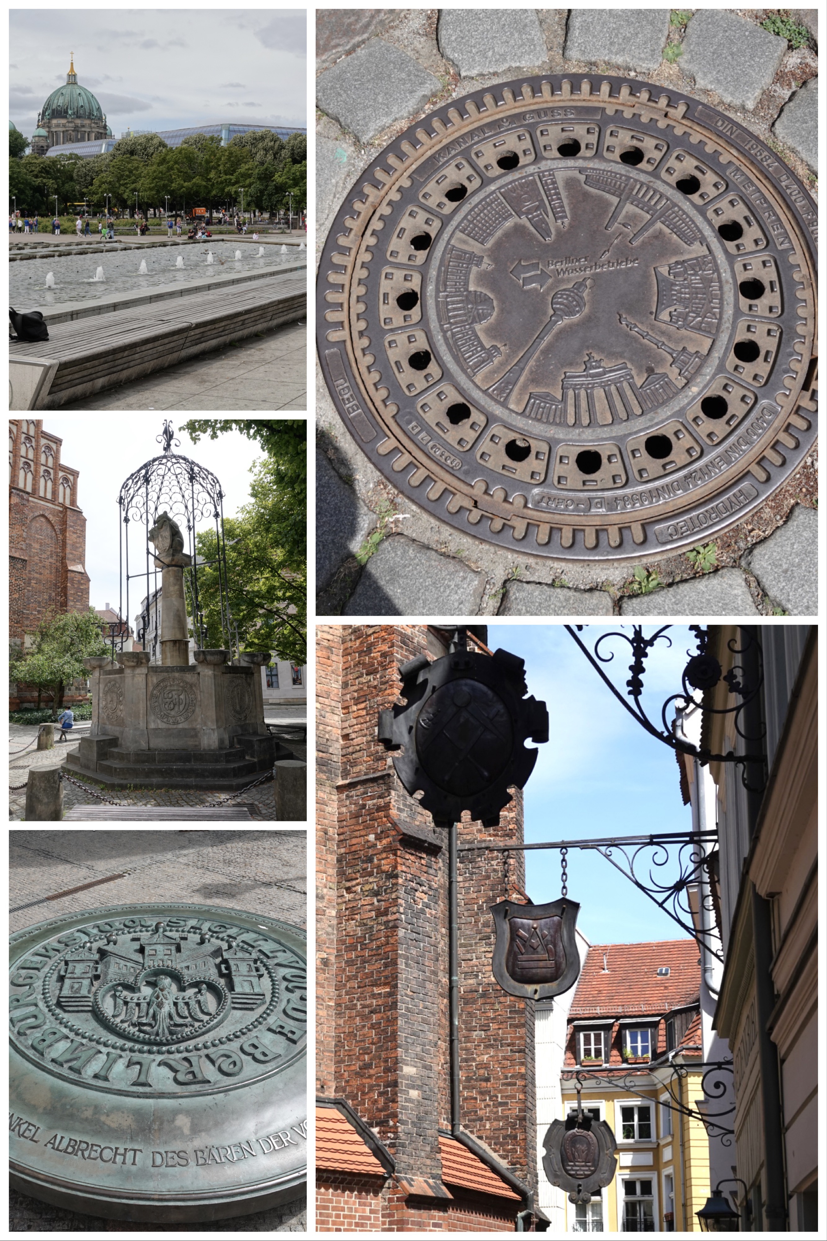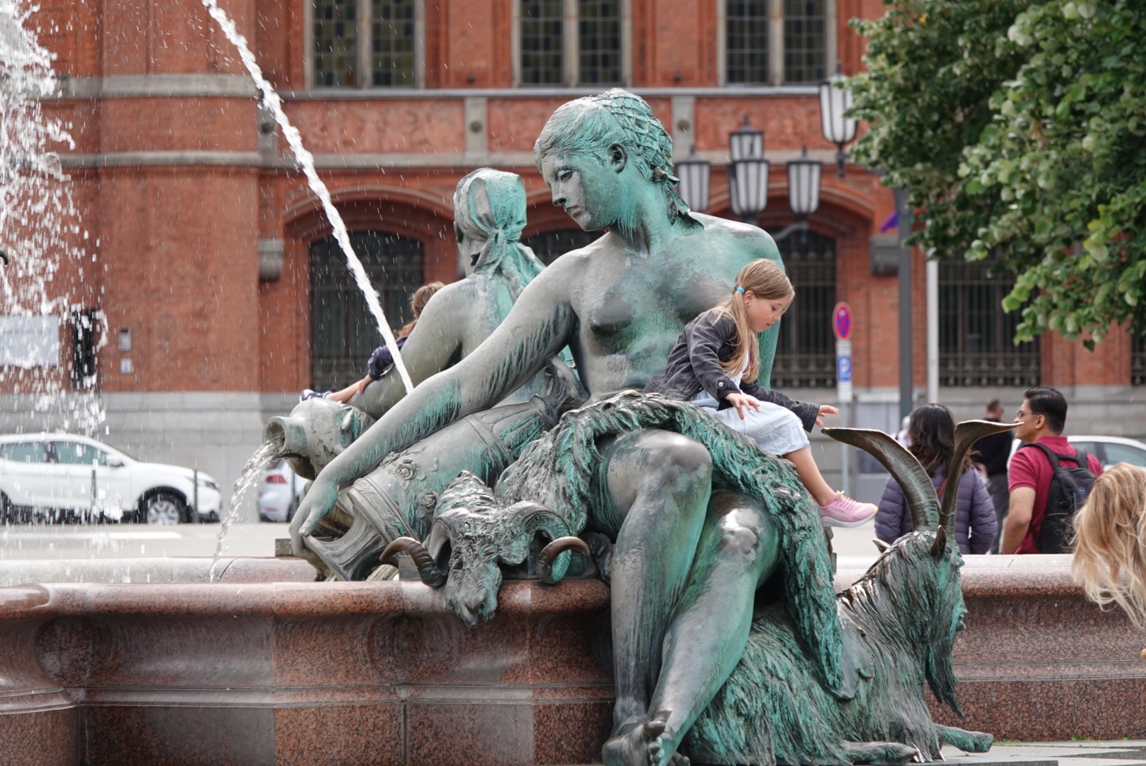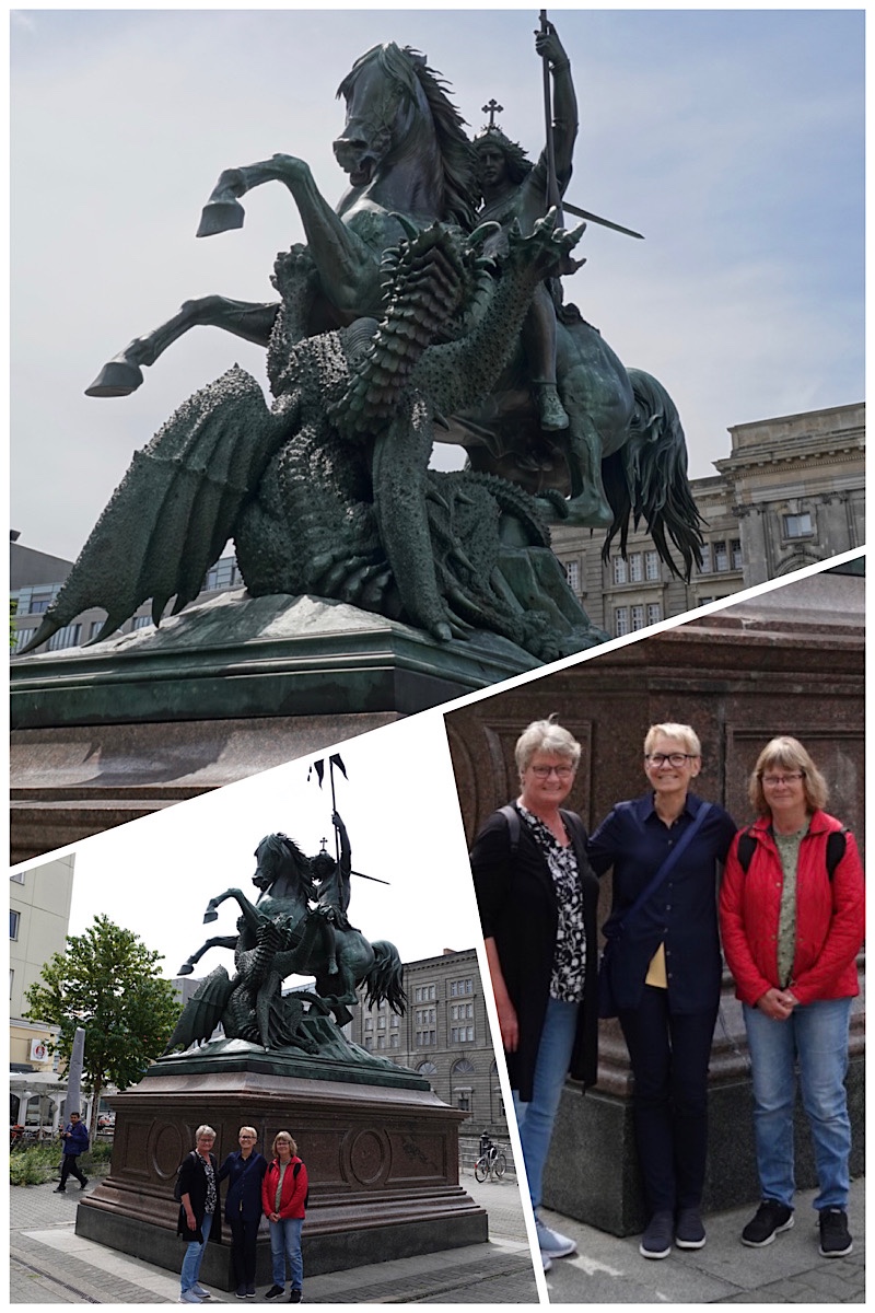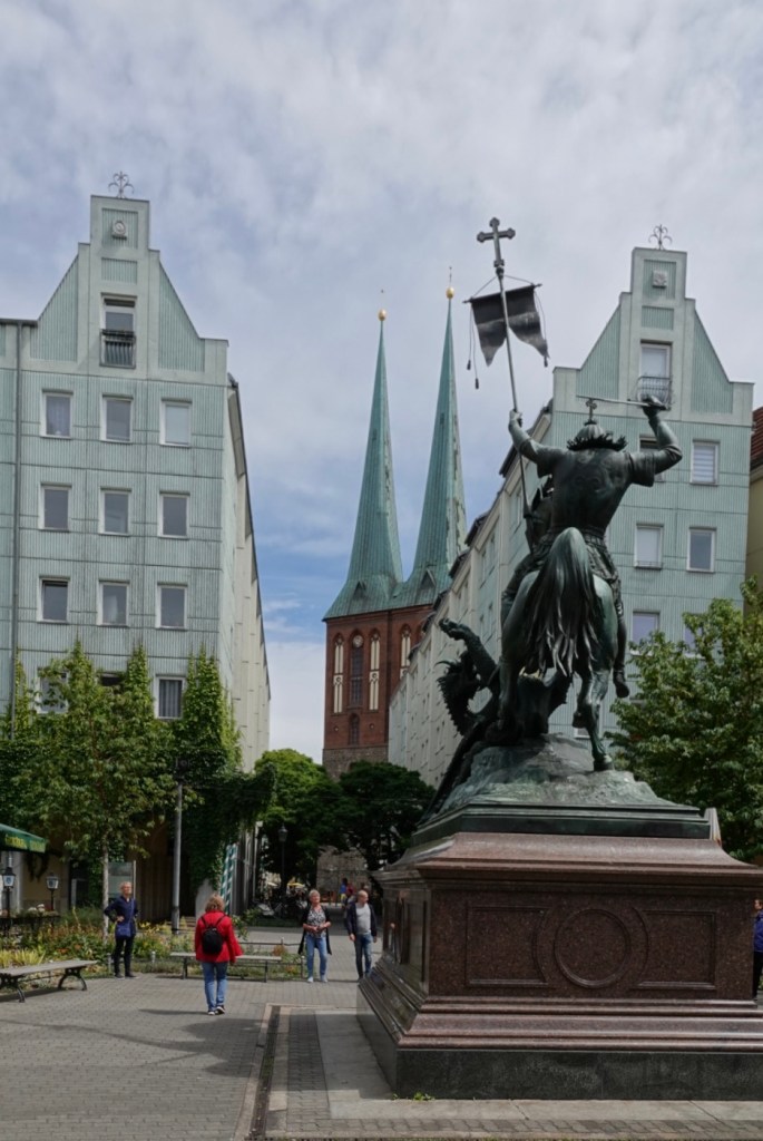 Once off the SBahn, we headed toward and into the Marienkirche (St. Mary’s Church), into the square housing the Neptune Fountain, past the Red City Hall, around the outside of the Berliner Dom (Berlin Cathedral), along the Spree to St. Nicholas’ Church, posed for photos at the statue of St. George slaying a dragon, pumped water from a unique old community water pump, and took an important hydration break at the Spreeblick restaurant on the river…. where Doris was finally able to get a Berliner Kindl !