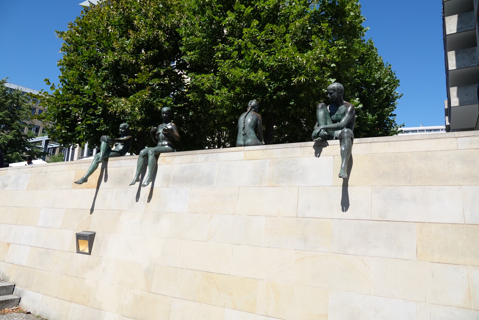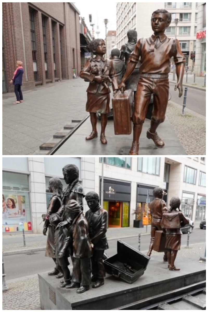 The first was a sculpture called TRAINS TO LIFE – TRAINS TO DEATH. During WWII, two kinds of “children’s transports” left the Friedrichstrasse train station. The first were in 1938-39, taking Jewish children from Germany, Austria, Czechoslovakia, and Danzig to England to be looked after by families there. The very first of these, carrying 190 children, started its route at this very station. The second kind of transports were those from 1941-1945 that transported children to death camps. The Israeli sculptor of this work, Frank Meisler, was himself a child of the 1939 Children’s Transport to England.