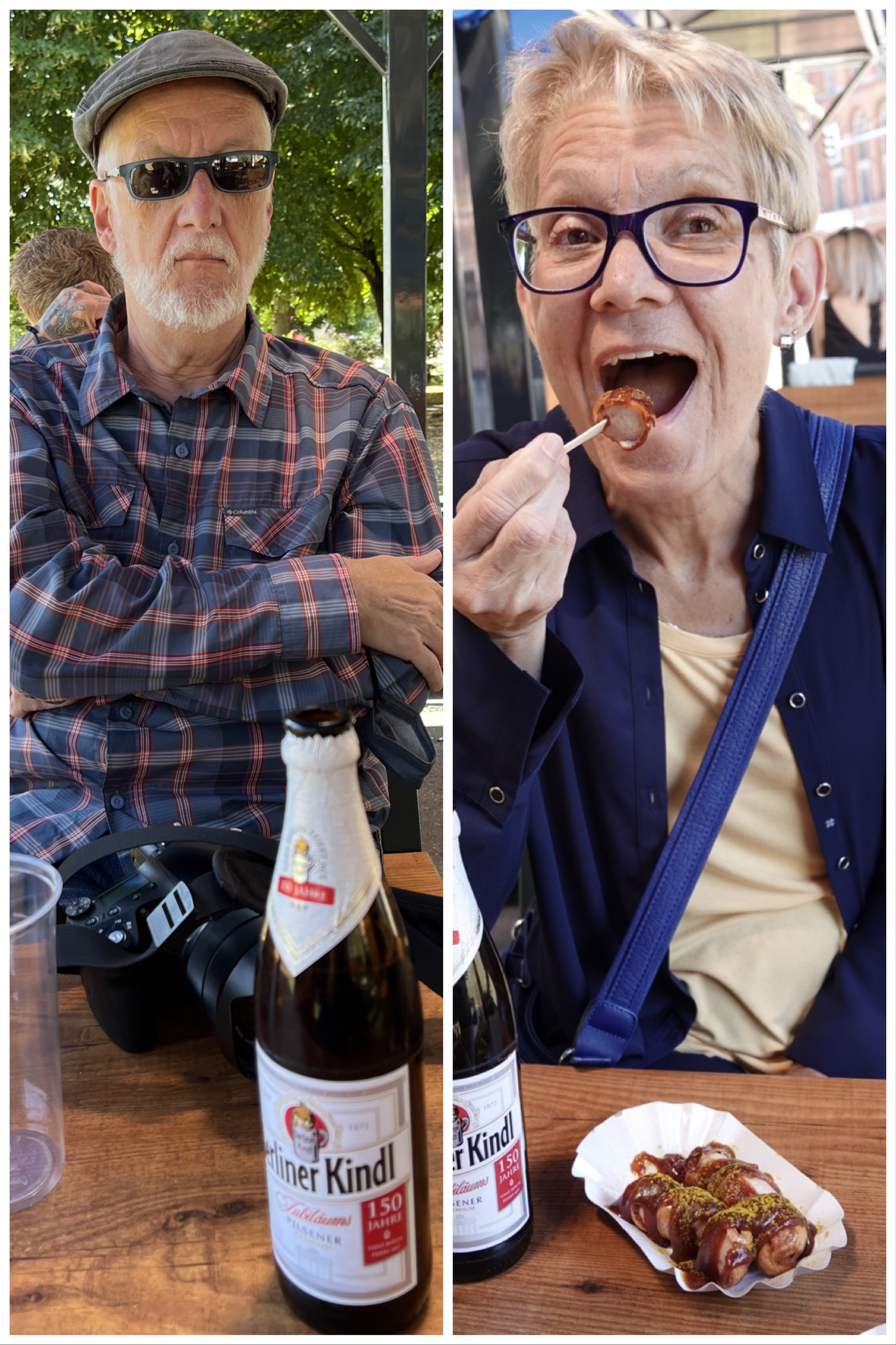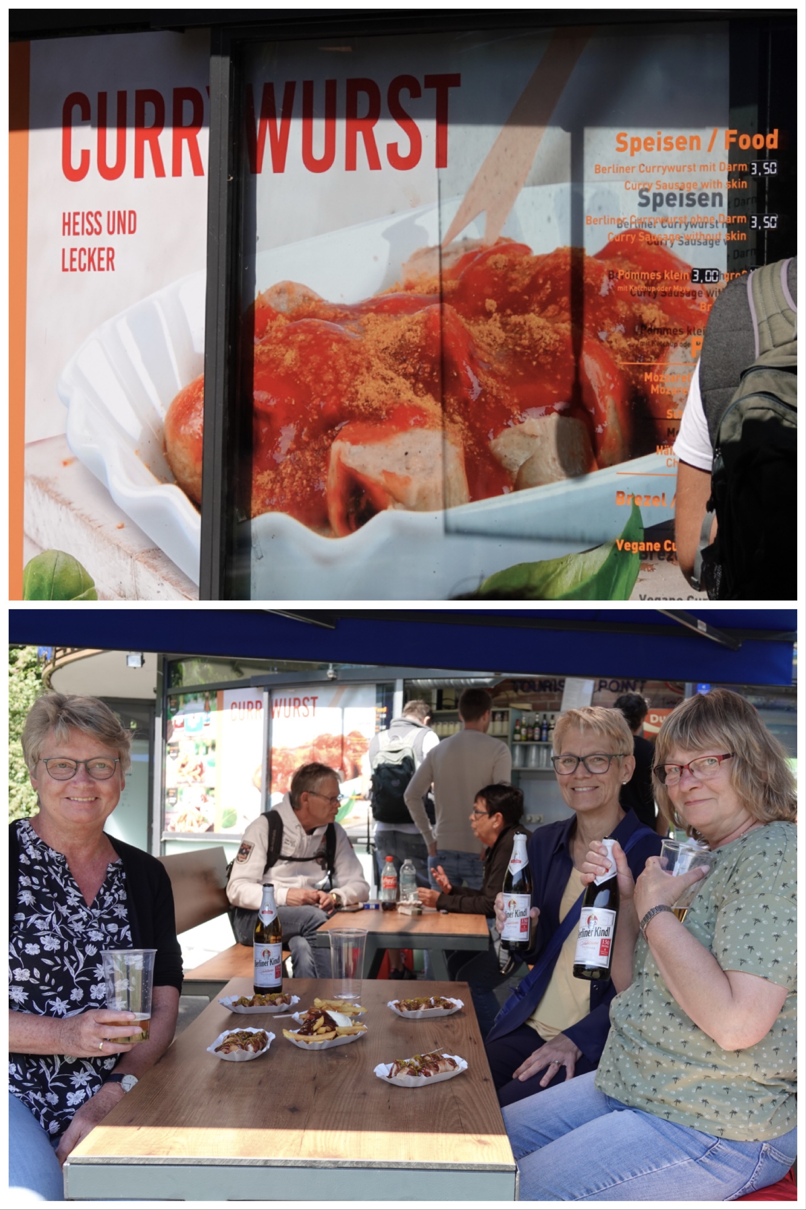 Then it was back to strolling the picturesque quarter, interrupted by a nutrition break: Curry wurst, pommes “red & white” (which is German for pommes frites with both ketchup and mayonnaise) and more Berliner Kindl (0.5 litre bottles!) Doris’ goal finally achieved.