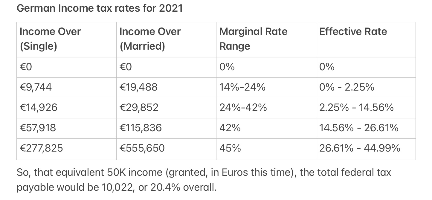 As with Canadian taxes, the German tax rate is progressive, with the first €9700 tax free, and subsequent income taxed in brackets.