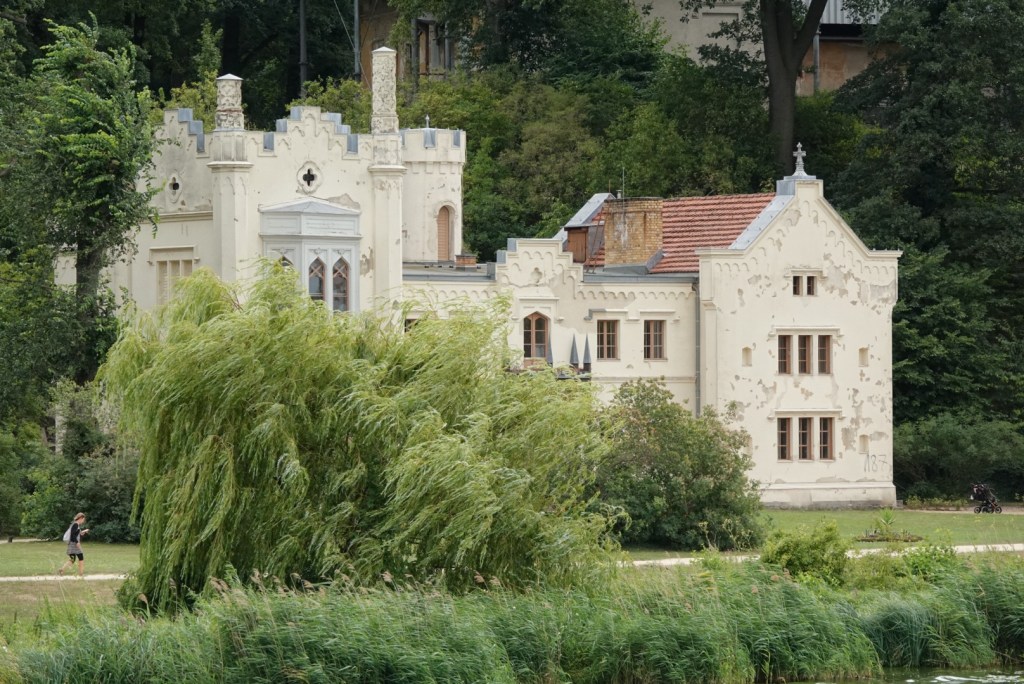 The small hunting lodge on Pfaueninsel (Peacock Island). The island was originally called Kaninchenwerder (rabbit pasture), since Elector Frederick William I of Brandenburg set up the island as a rabbit breeding spot in the 17th century. No idea why he thought rabbits needed a protected place to breed. Frederick William II regularly lived on the island with his mistress in a castle built in 1794, not visible from our boat. At any rate, there are no peacocks here except a couple who may be descendants of Frederick William III’s early 1800’s menagerie here.