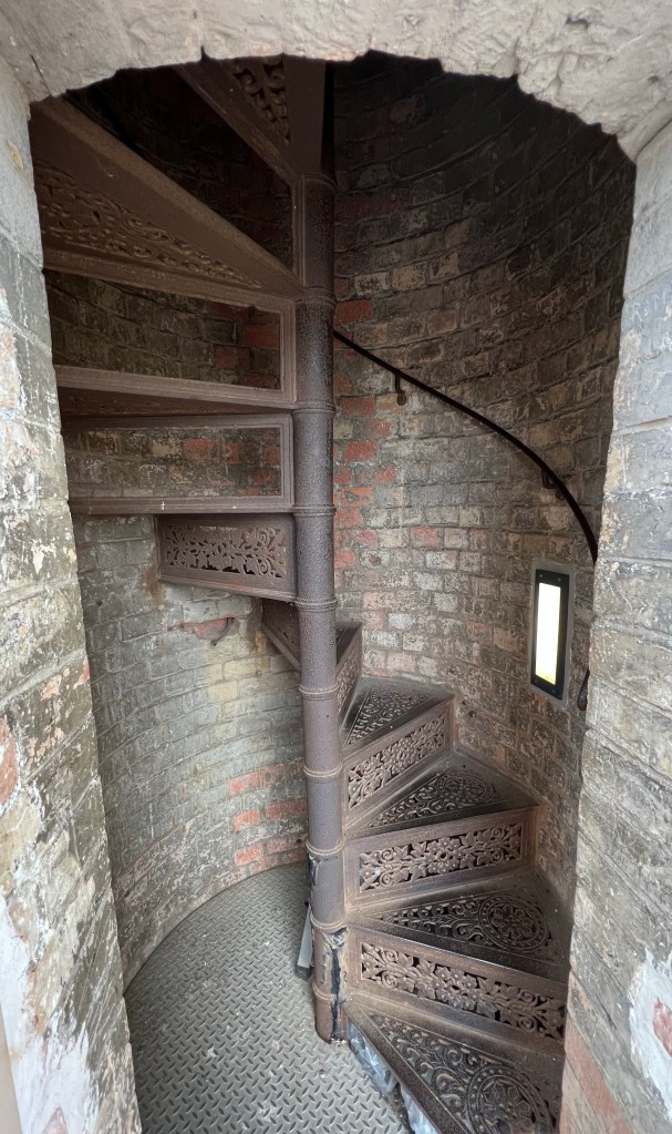 A choice now had to be made to climb a further spiral staircase, with original decorative wrought iron stairs, in an even narrow, even darker tower, and in an even tighter spiral. A green light indicated whether the stairs were open for transiting.
