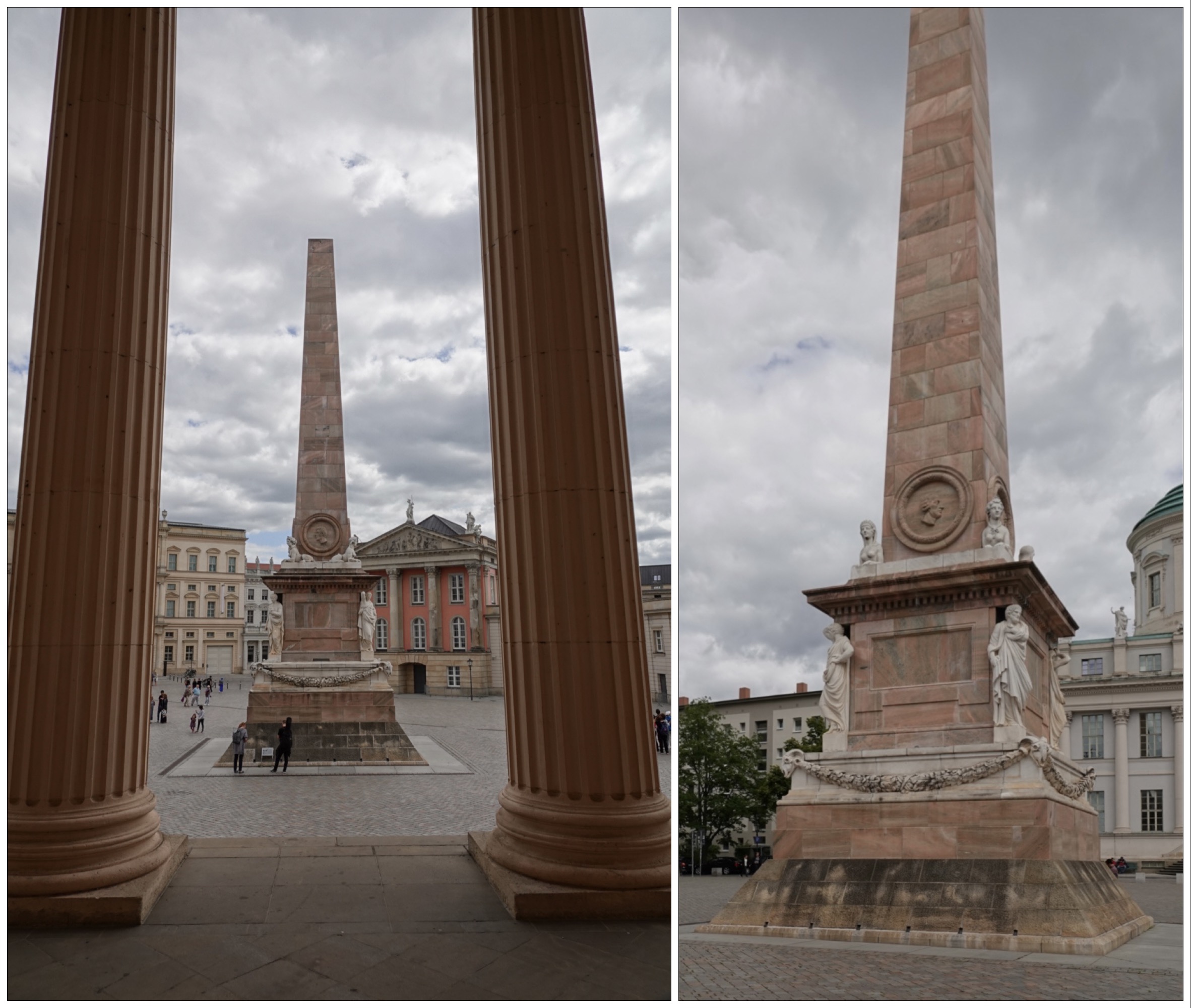 The shaft of the obelisk originally depicted rulers of the House of Hohenzollern who had heavily influenced Potsdam: Frederick William, Elector of Brandenburg, as well as the kings Frederick I, Frederick William I, and Frederick the Great. During restoration the references to the old rulers were removed and replaced by portraits of Potsdam’s most important architects: Georg Wenzeslaus von Knobelsdorff (shown on the medallion in the collage below), Carl von Gontard, Karl Friedrich Schinkel, and Friedrich Ludwig Persius. Thus the proletariat replaced the aristocracy on the obelisk. The sphinxes had to be reconstructed, but amazingly the four antique statues of ancient orators at the base are still the originals, made by Gottlieb Heymüller.