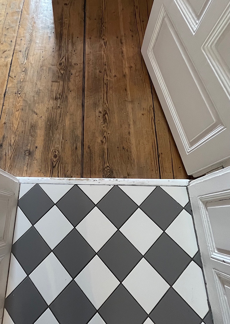 Everything except the wide solid wood plank and ceramic tile floors has been modernized.