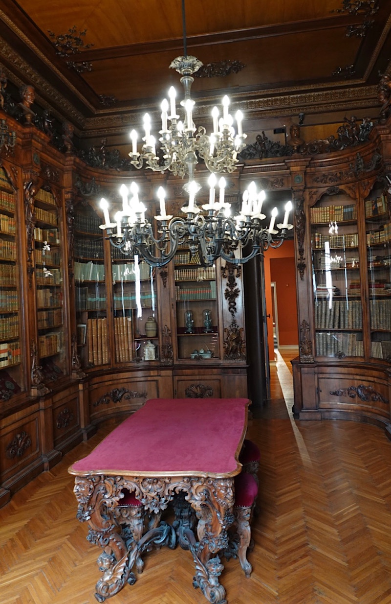 Revoltella’s library is also on the first floor. The glass-door bookcases are filled with first editions and the Baron’s own travel memoirs. At one end of the library is a “secret door” disguised as one of the bookcases, that used to lead to the Baron’s bathroom!
