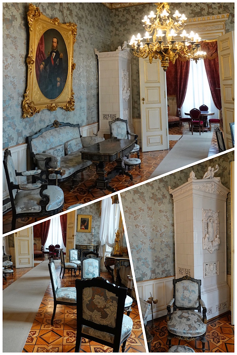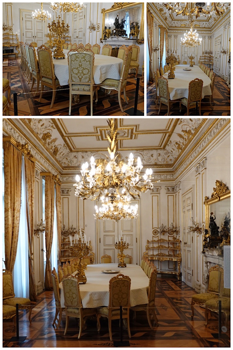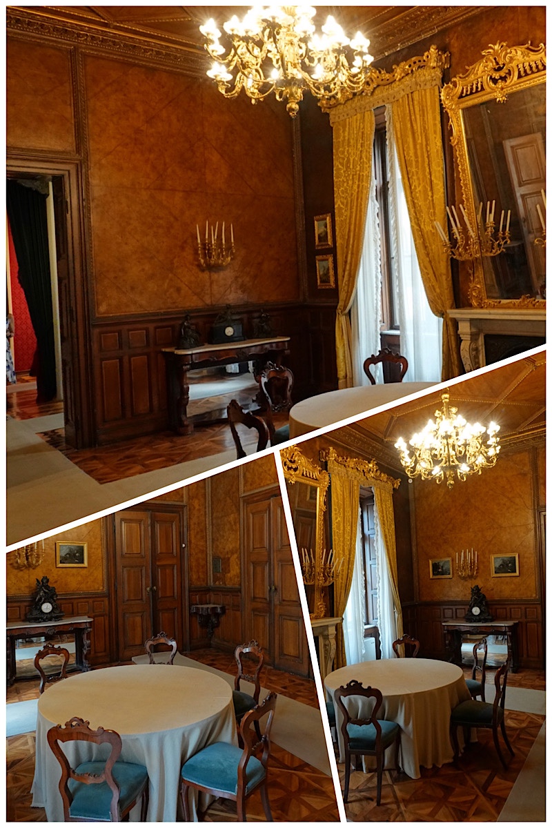 The formal dining room, with its gold upon gold decoration, reminded me of the dining rooms in royal palaces we’ve toured. We read on the room’s info sheet that the Baron’s parties and dinners were the premiere events of the Trieste social season, and featured incredible elaborate menus (a butter sculpture of hounds hunting a full sized boar; “crocodiles” made of 20 kinds of fish and seafood; wines from all over Europe; oranges imported from Sicily and pineapples from Syria and Lebanon) and “party favours” like Belgian lace and Japanese fans for the ladies in attendance.