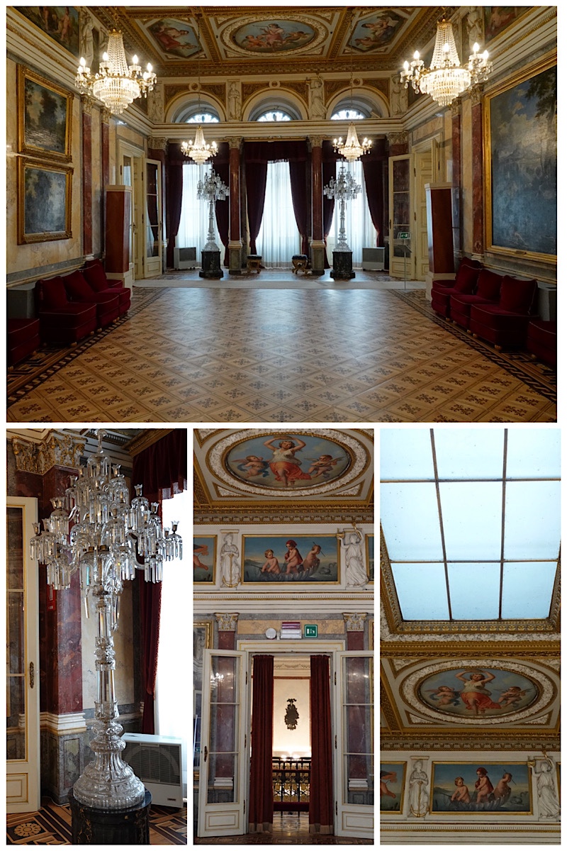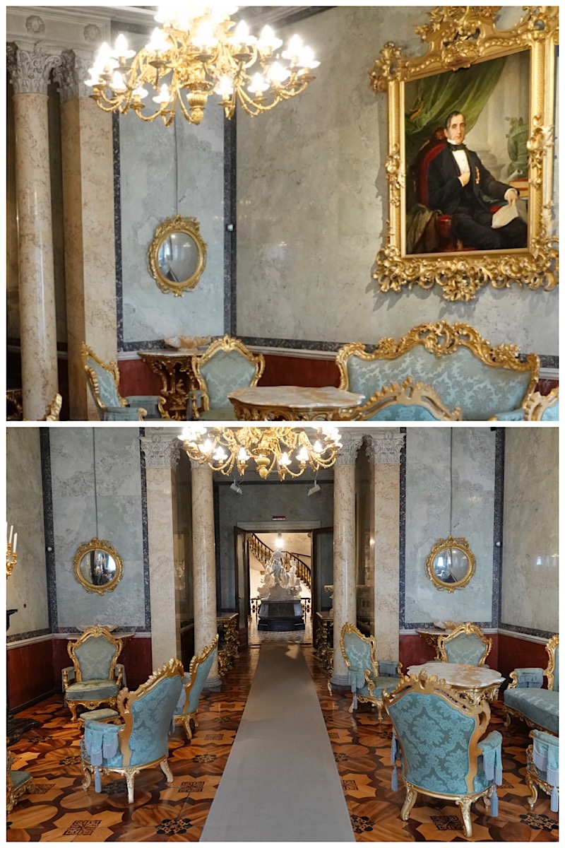 In the centre of the piano nobile is the ballroom (below) entirely covered with fake green and red marble and lit by a second skylight and French windows opening on the façade’s terrace. We were impressed with the crystal candelabra that were as tall as we are.