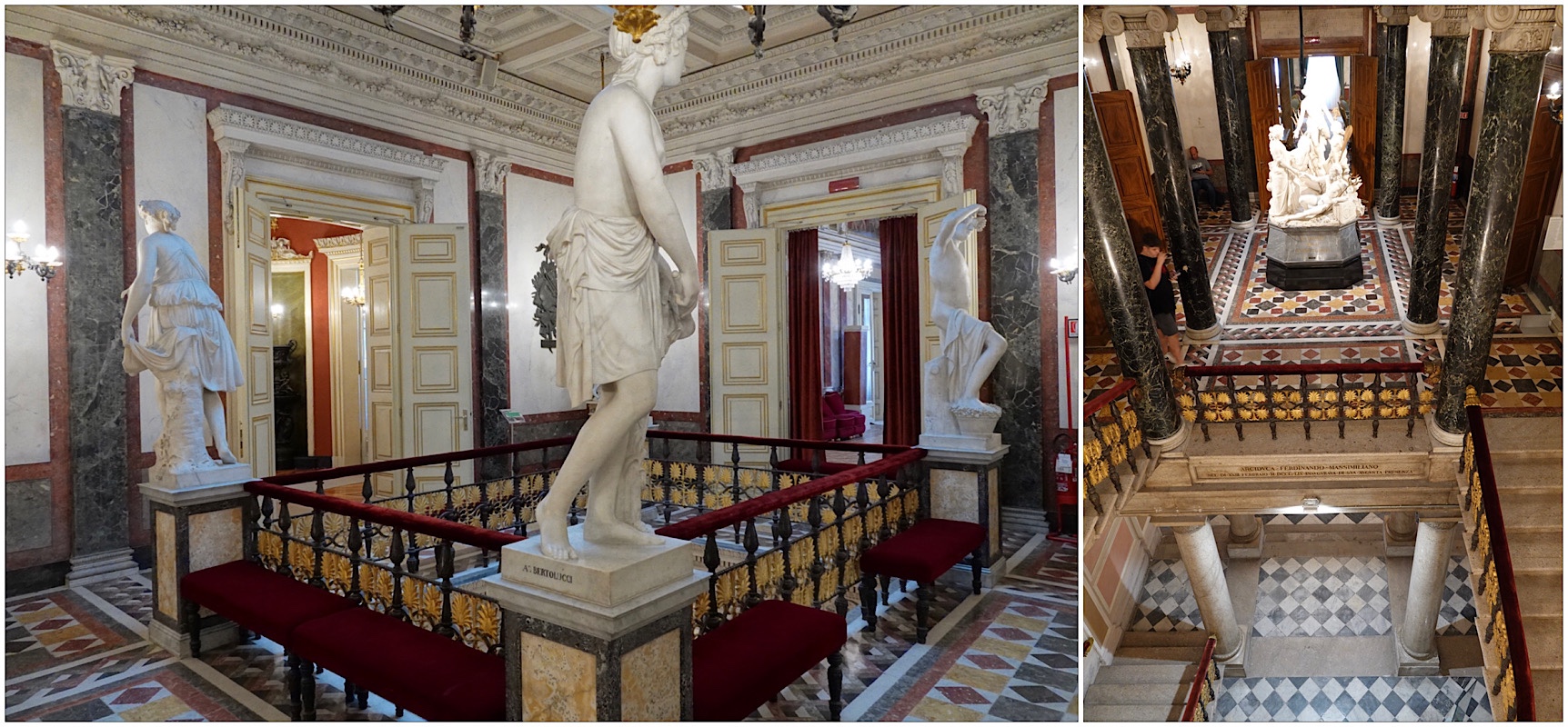At the bottom of the staircase is a large marble “group”, representing the construction of the Trieste aqueduct. The seated female figure is Trieste, receiving water from the nymph emerging from the caverns; the angels drinking water symbolize the workmen and sailors of Trieste quenching their thirst.