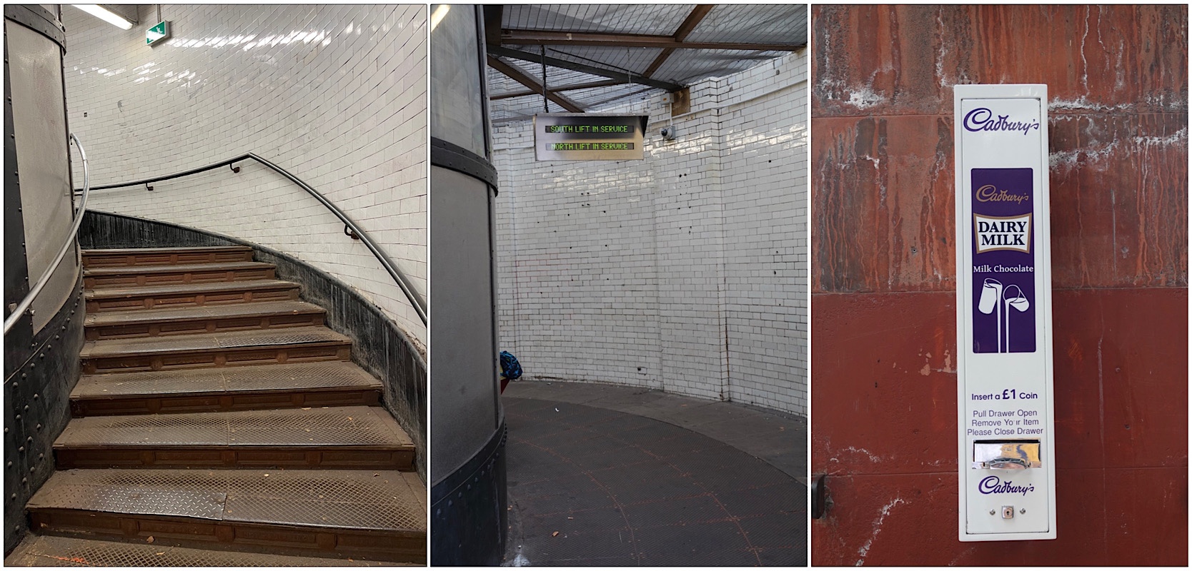 The only section I expected to find a bit disconcerting was the northern end that was damaged by bombs on the first night of the Blitz (September 8/9 1940) in WWII, since after being repaired and reinforced it is quite a bit narrower in diameter than the rest of the tunnel, but even that is brightly lit – and it’s actually quite interesting to see the infrastructure without tile covering it.