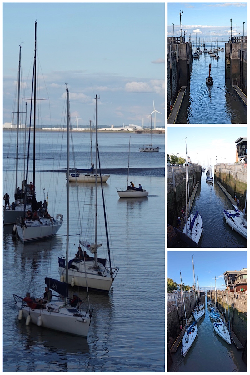 After the race ended, all the boats headed for the Portishead Marina, where they have to go into a lock in order to reach their berths. While Ted and I have seen many boats enter locks, and have been in both the Suez and Panama Canals, we’ve never experienced a lock located in tidal waters. While the sailboats lined up waiting for their turn to enter the lock, they need to counteract the tidal flow – and cannot use anchors in the muddy bottom to hold their place. Bert described it as akin to gridlock on a steep hill, where all the cars are standard transmission and no one has a hand brake – they’re all “riding the clutch”. It doesn’t sound like fun!