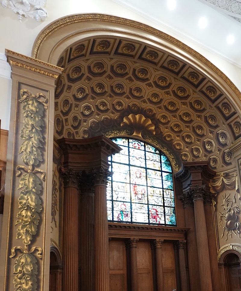 One of the interior features I found most interesting was the trompe l’oeil painting all around the stained glass window behind the altar.