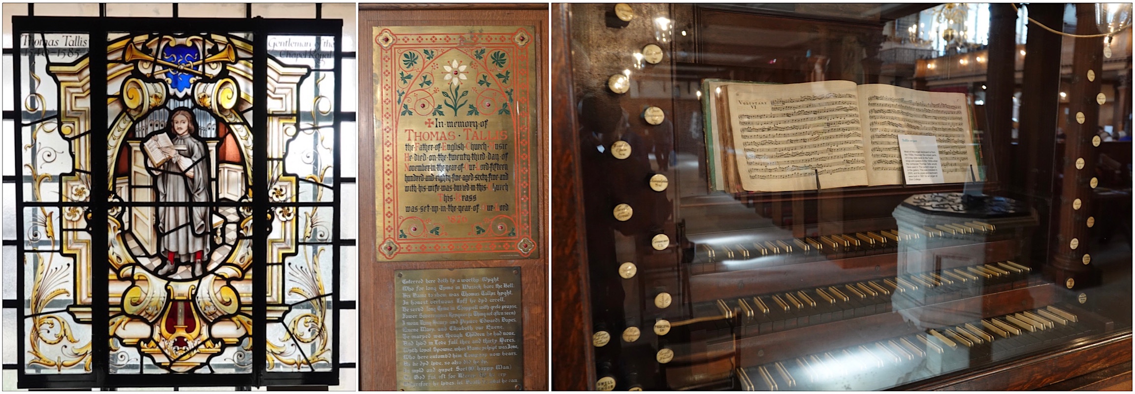 Somewhere under the east end of the church, Thomas Tallis, the “father of English church music” is buried. During his lifetime he played the organ here for Henry VIII, Edward VI, Mary, and Elizabeth I. Even though he died in 1585, his music is still played and sung by the choir. A section of his 16th century organ keyboard is on display in the church.