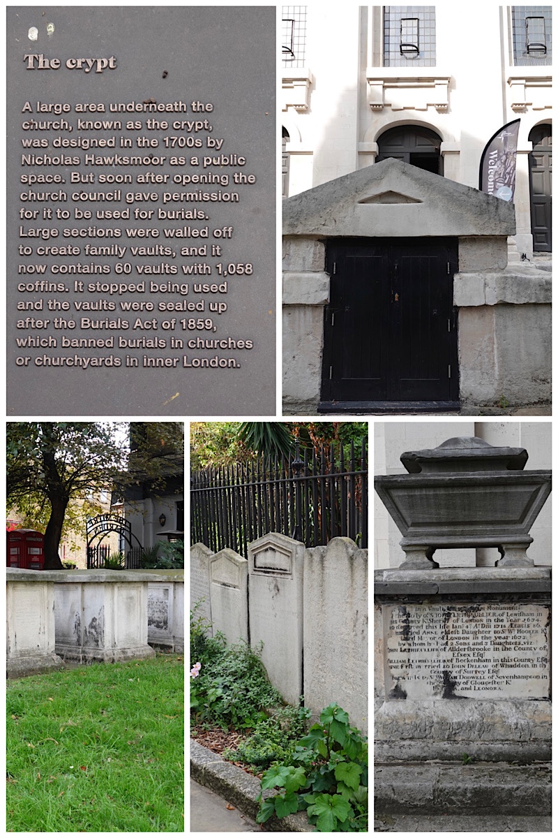 The crypt under the raised church building, erected in the 1700’s, was originally intended as a public space, but quickly turned into a burial place. It houses 60 vaults and over 1000 coffins, although none are more recent than 1859, for reasons shown below.