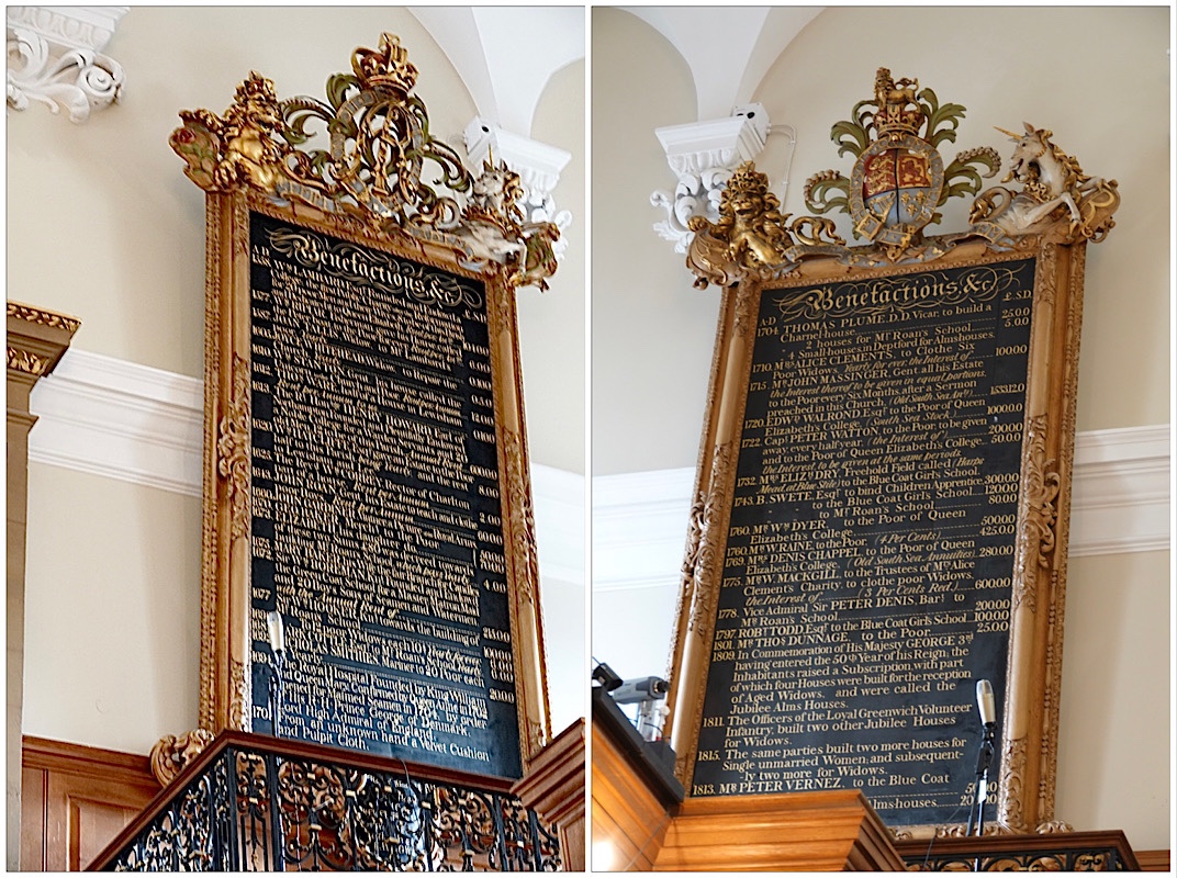 At the front of the church are two huge wooden plaques with the names of benefactors dating back to 1613, showing the donor’s name, amount given, and use to which the money was put (almshouses, schools, homes for unmarried mothers and widows, mariners pensions, etc, or sometimes simply “to the poor”). Many of the buildings that were funded still exist. The biggest donation was £600 in 1613 by the Rt. Hon. Henry Howard. In 2015 money (according to the church’s brochure) that was the equivalent of £32M/$36 million USD/$48 million CAD.