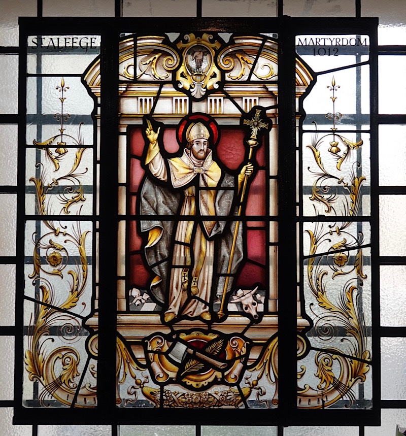 The stained glass window (below) dedicated to St. Alfege shows both an ox skull and an axe. History is weird and horrible.