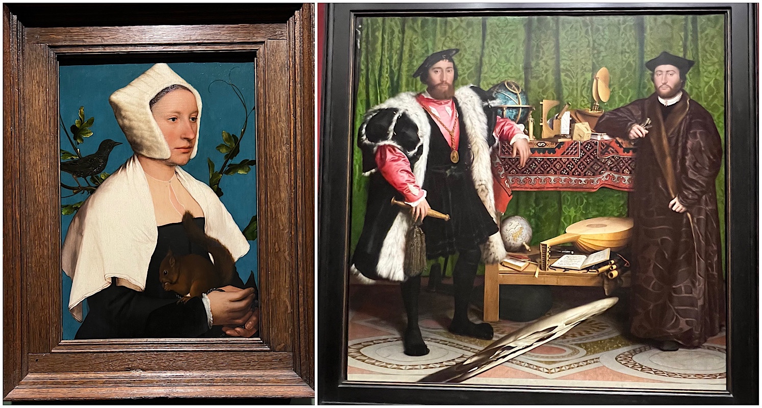 Two paintings by Hans Holbein the Younger, who also famously painted portraits of Ann Boleyn and the Tudor Court of Henry VIII. Left: A Lady with a Squirrel and a Starling, 1526-8. Right: Jean de Dinteville and Georges de Selves, “The Ambassadors”, 1533.