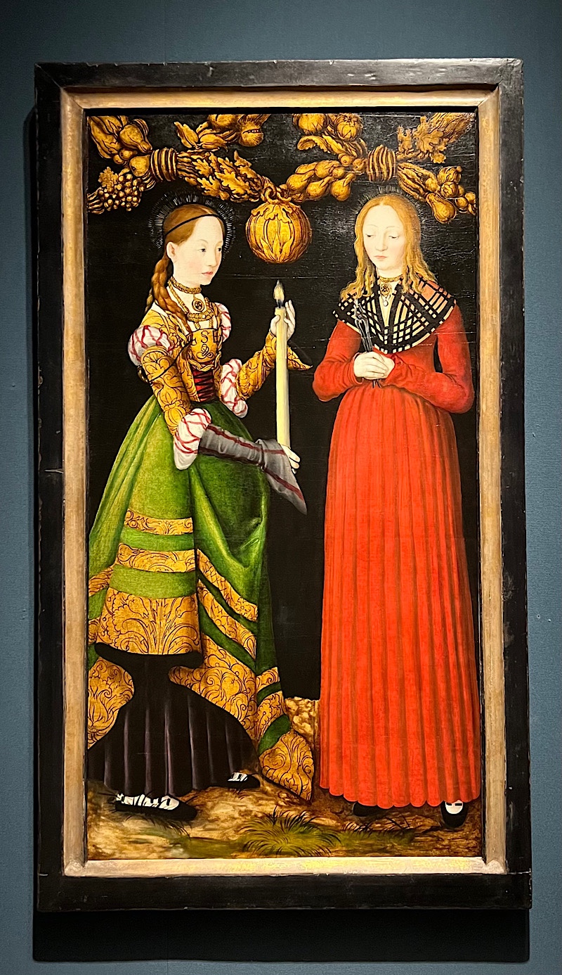 Saints Genevieve and Apollonia, 1506, by Lucas Cranach the Elder. This lovely and yet quietly gruesome painting was once part of a pair of shutters for the altarpiece of Frederick the Wise, Elector of Saxony. Saint Genevieve hold a candle she miraculously relit when the devil blew it out. Saint Apollonia hold the pincers with which her teeth were extracted under torture!!