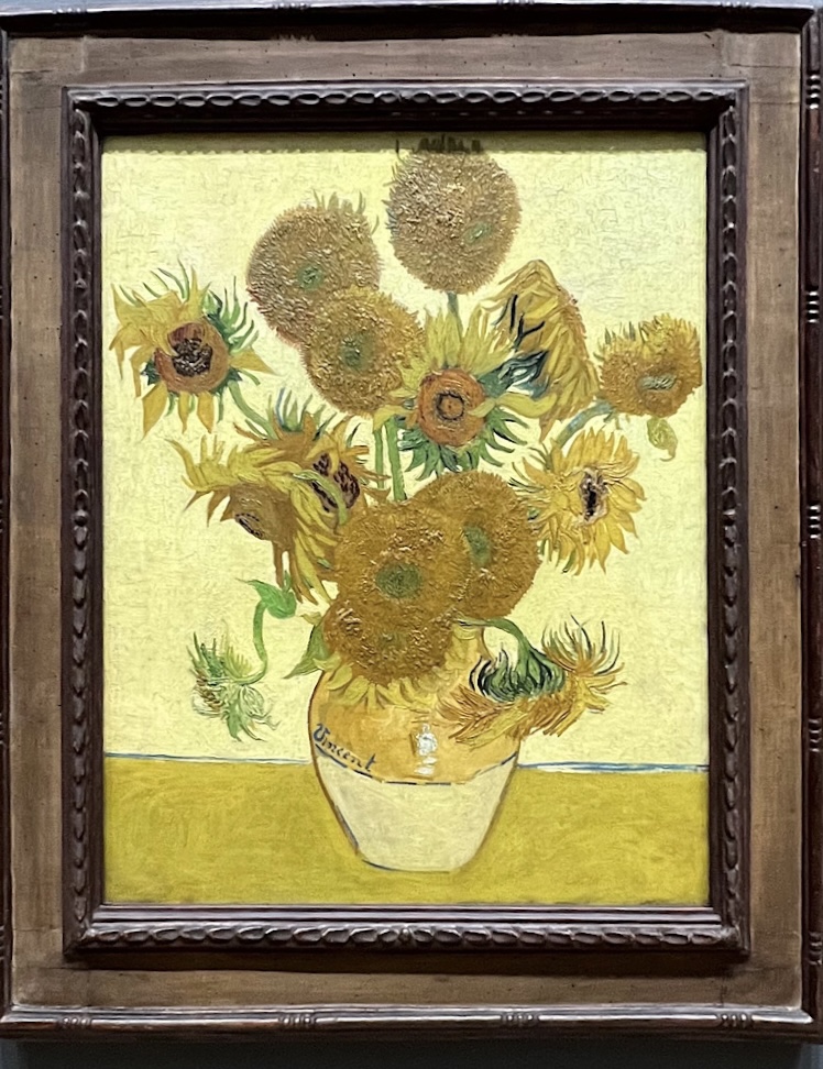 It may not have the visceral impact on me that seeing “Starry Starry Night” at the MoMA in New York City did, but van Gogh’s “Sunflowers” (1888) still pull me in. Apparently he painted his 4 sunflower canvases to decorate his house in Arles; this one was hung in the guest room in anticipation of the arrival of his friend Paul Gaugin.
