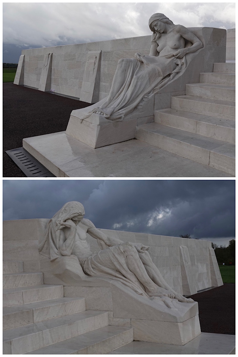 On the west side (back) of the monument are 2 figures representing mourning parents, one female and one male. Like all the figures, they were carved where they now sit. The mother (top) holds a newspaper. We learned that in Britain, when a soldier was killed or lost, their family was informed by mail, leading to a dread of the postman – but Canada was too big a country with too sparse a population for that to be practical or timely, so names of killed or lost soldiers were published in the daily newspaper. As parents, we couldn’t even imagine what that would be like.