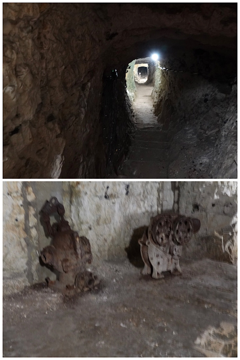 Bottom: an old corroded air pump to deliver breathable air to the tunnellers and explosives handlers.