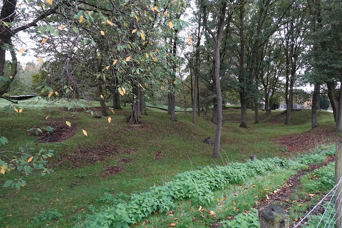 The newly planted elm trees here have cages around them with blue or red tops. The blue tops represent the location of the British front line. The red tops represent the location of the German front line.