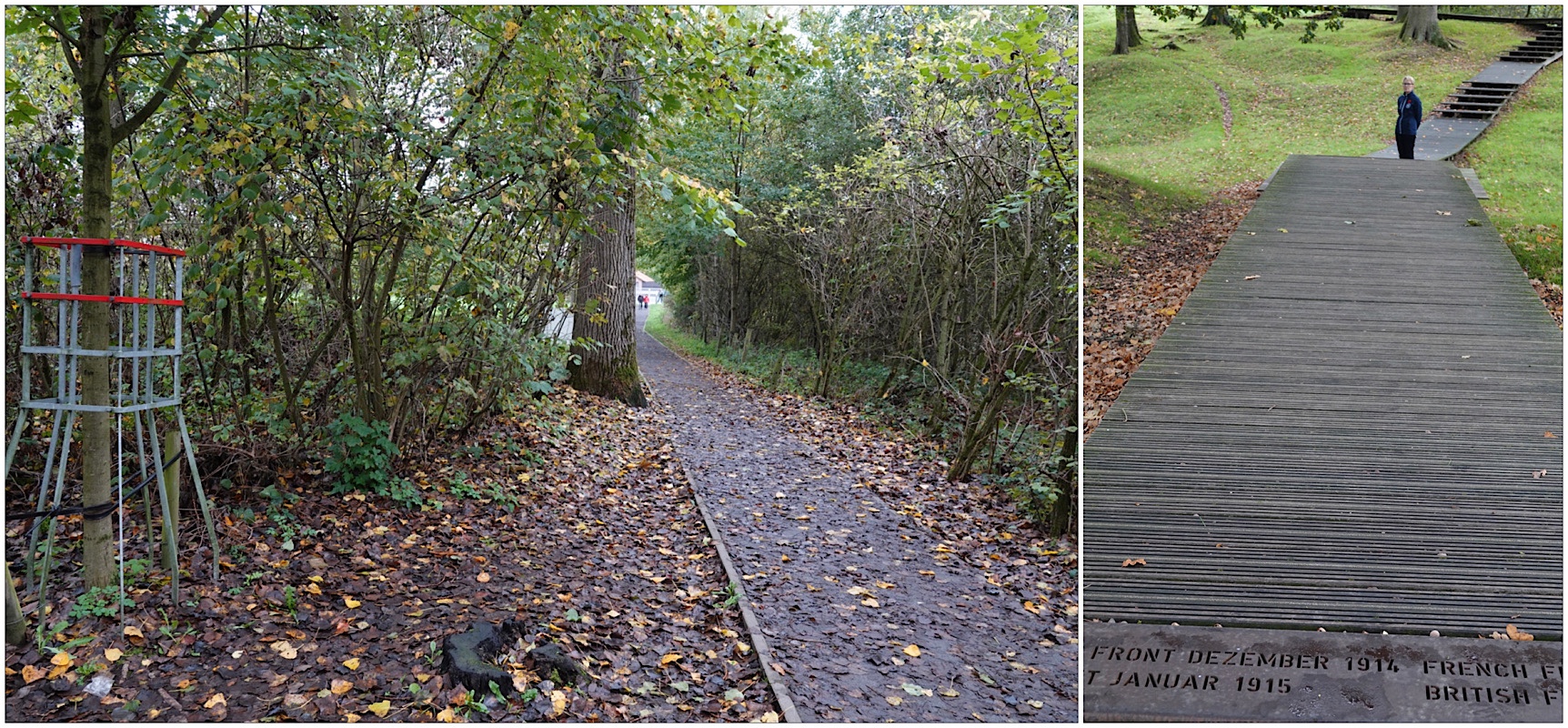 Left: a red-caged elm (German front line). Right: I’m standing on the German front line marker, with the British front line in the foreground, from which Ted took the photo.