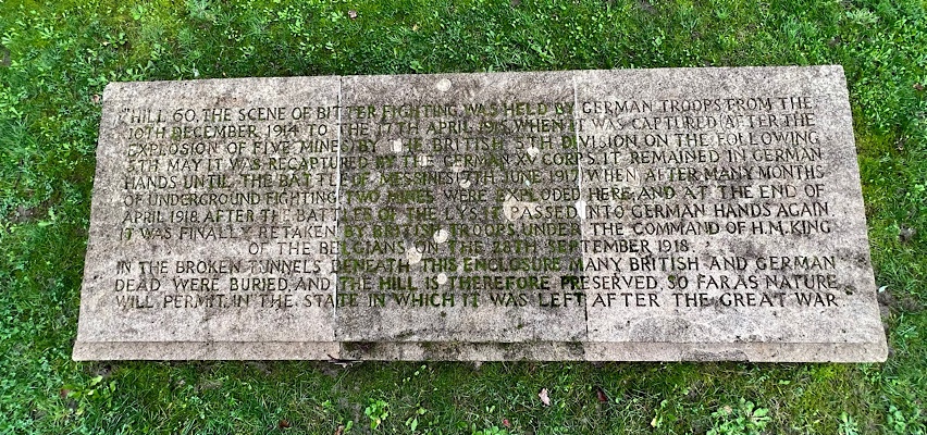 HILL 60 THE SCENE OF BITTER FIGHTING WAS HELD BY GERMAN TROOPS FROM THE 16TH DECEMBER 1914 TO THE 17TH APRIL 1915 WHEN IT WAS CAPTURED AFTER THE EXPLOSION OF FIVE MINES BY THE BRITISH 5TH DIVISION. ON THE FOLLOWING 5TH MAY IT WAS RECAPTURED BY THE GERMAN XV CORPS. IT REMAINED IN GERMAN HANDS UNTIL THE BATTLE OF MESSINES 7TH JUNE 1917 WHEN AFTER MANY MONTHS OF UNDERGROUND FIGHTING TWO MINES WERE EXPLODED HERE AND AT THE END OF APRIL 1918 AFTER THE BATTLES OF THE LYS IT PASSED INTO GERMAN HANDS AGAIN. IT WAS FINALLY RETAKEN BY BRITISH TROOPS UNDER THE COMMAND OF H.M.KING OF THE BELGIANS ON THE 28TH SEPTEMBER 1918. IN THE BROKEN TUNNELS BENEATH THIS ENCLOSURE MANY BRITISH AND GERMAN DEAD WERE BURIED AND THE HILL IS THEREFORE PRESERVED SO FAR AS NATURE WILL PERMIT IN THE STATE IN WHICH IT WAS LEFT AFTER THE GREAT WAR