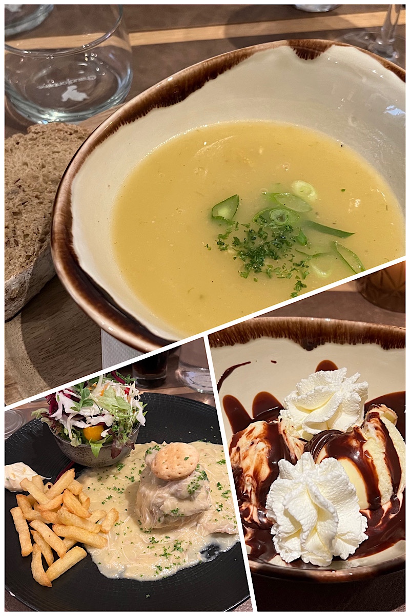 Top: cream of chicken soup garnished with spring onions, served with fresh crusty rue bread and creamery butter. Left: vol-au-vent stuffed with chicken, served with herb salad and a big bowl of Belgian frites to be shared by the 4 of us. Mayo on the side , of course. Right: vanilla ice cream with whipped cream and Belgian chocolate sauce.