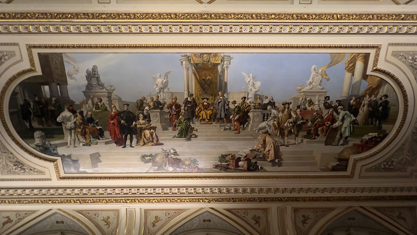 Gallery 19 and its spectacular ceiling fresco . When the museum opened in 1891, this central gallery was designed to impress visitors with the importance of the Habsburgs as patrons of the arts. The ceiling painting by Julius Victor Berger celebrates exceptional patrons of the family, in the company of their most important artists and surrounded by objects from the museum’s holdings.