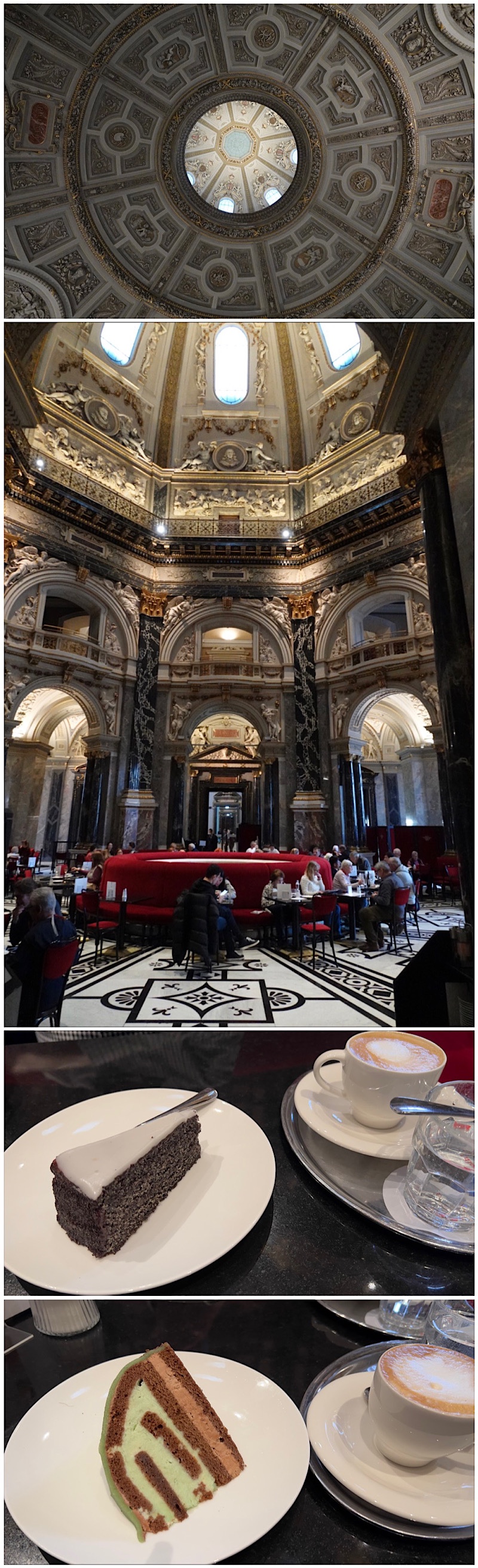 “Lunch” was a pastry chef’s work of art in the museum’s first floor rotunda: Mohn torte (poppy seed torte), and Mozart torte ( chocolate sponge, chocolate buttercream, pistachio mousse, and marzipan icing). In Vienna, cake simply cannot be eaten without good coffee: two Viennese Mélanges.