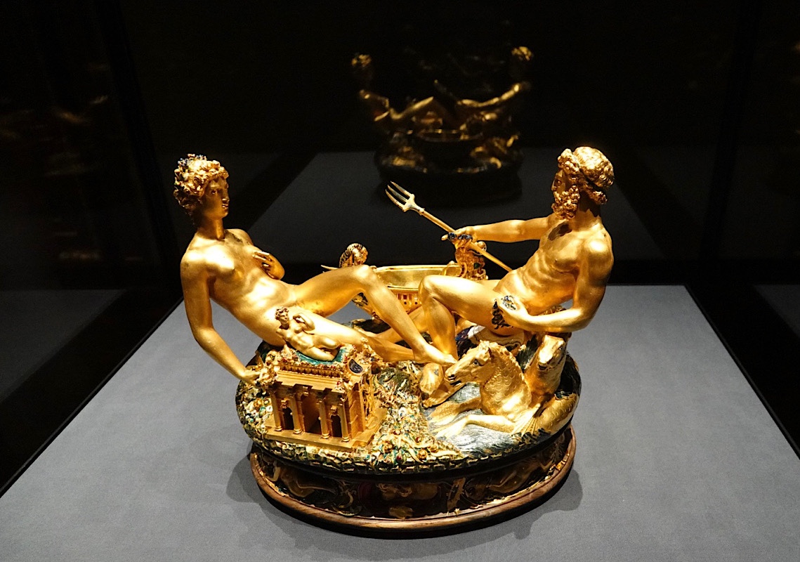 A gold, ebony, ivory and enamel “saliera” (container for salt and pepper) made by famous Florentine artist Benvenuto Cellini in Paris in 1540.