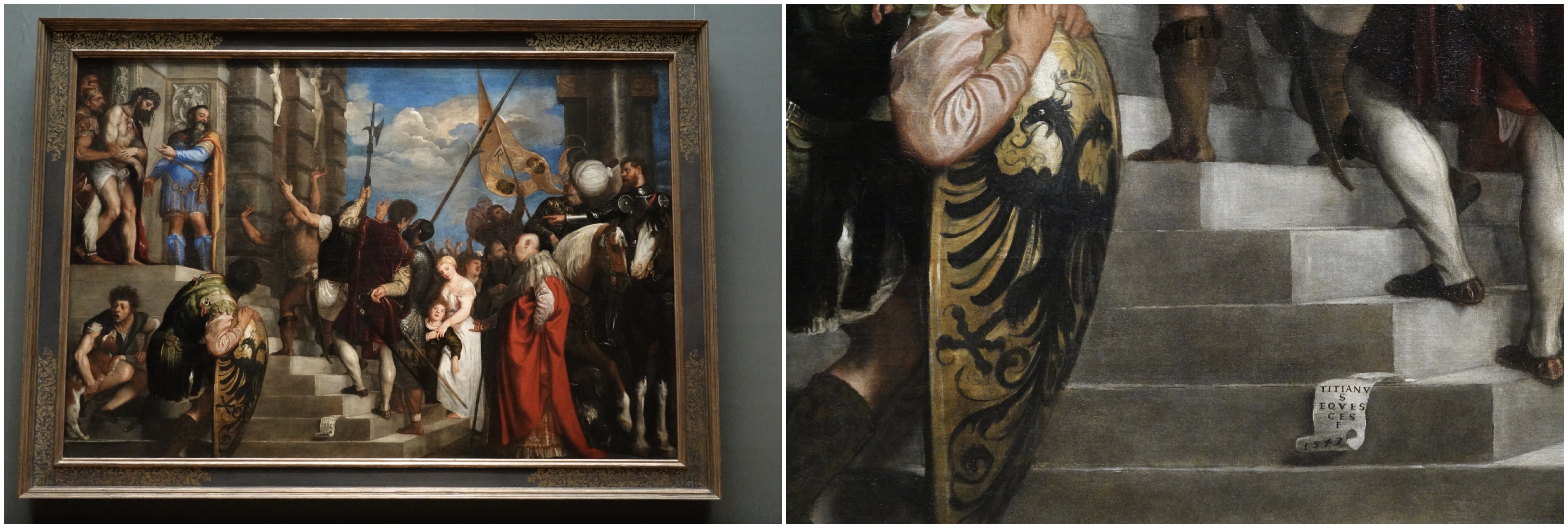 Ecce Homo., by Titian, 1543. The artist’s signature appears on the staircase. The double eagle shield is homage to the Habsburg imperial court, whose official painter Titian became in 1533.