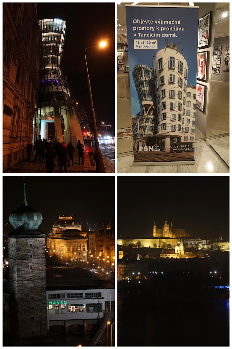 Canadian architect Frank Gehry is everywhere. We’ve seen his work at home as well as in Panama, New York, Los Angeles, Barcelona, and now here in Prague. His “Dancing House” immediately made me think of a beautiful 1960’s Dior dress, with its small waist and bell-shaped skirt. We should get a daylight picture of it on our panoramic tour tomorrow, but tonight we went inside to take advantage of its eighth floor open air viewing platform.