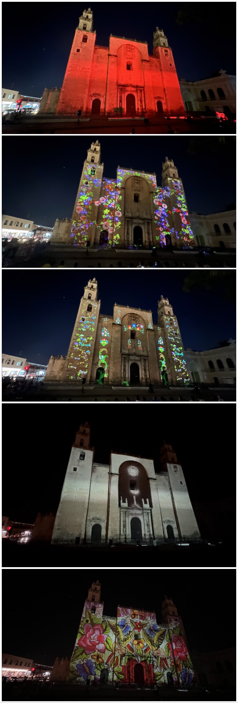 We arrived early enough to get seats and watch the set-up of the videomapping, which was really interesting. Twelve different projections of the cathedral itself had to be lined up exactly to the physical architecture of the cathedral in order to allow the final show to use those 12 as one huge connected image. The light show told the story of the cathedral, beginning with the unspoiled flora and fauna of the Yucatan (gorgeous hummingbirds, flowers, and butterflies flying and growing on the cathedral walls). Next came a series of images acknowledging that the cathedral was built on the site of Mayan ruins, using Mayan building stones, followed by images of the arrival of the Spanish via ship, the cathedral being built, and ending again with flowers.