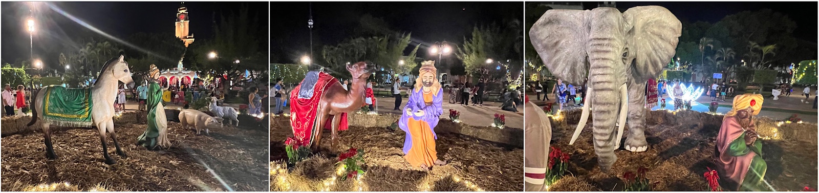 After the light show, we took a walk through the adjacent Plaza Grande/Plaza Principal de Mérida to check pit the Christmas lights and huge nativity scene featuring the 3 Kings from the east: one with an Arabian horse, one with a camel, and the third with an elephant.
